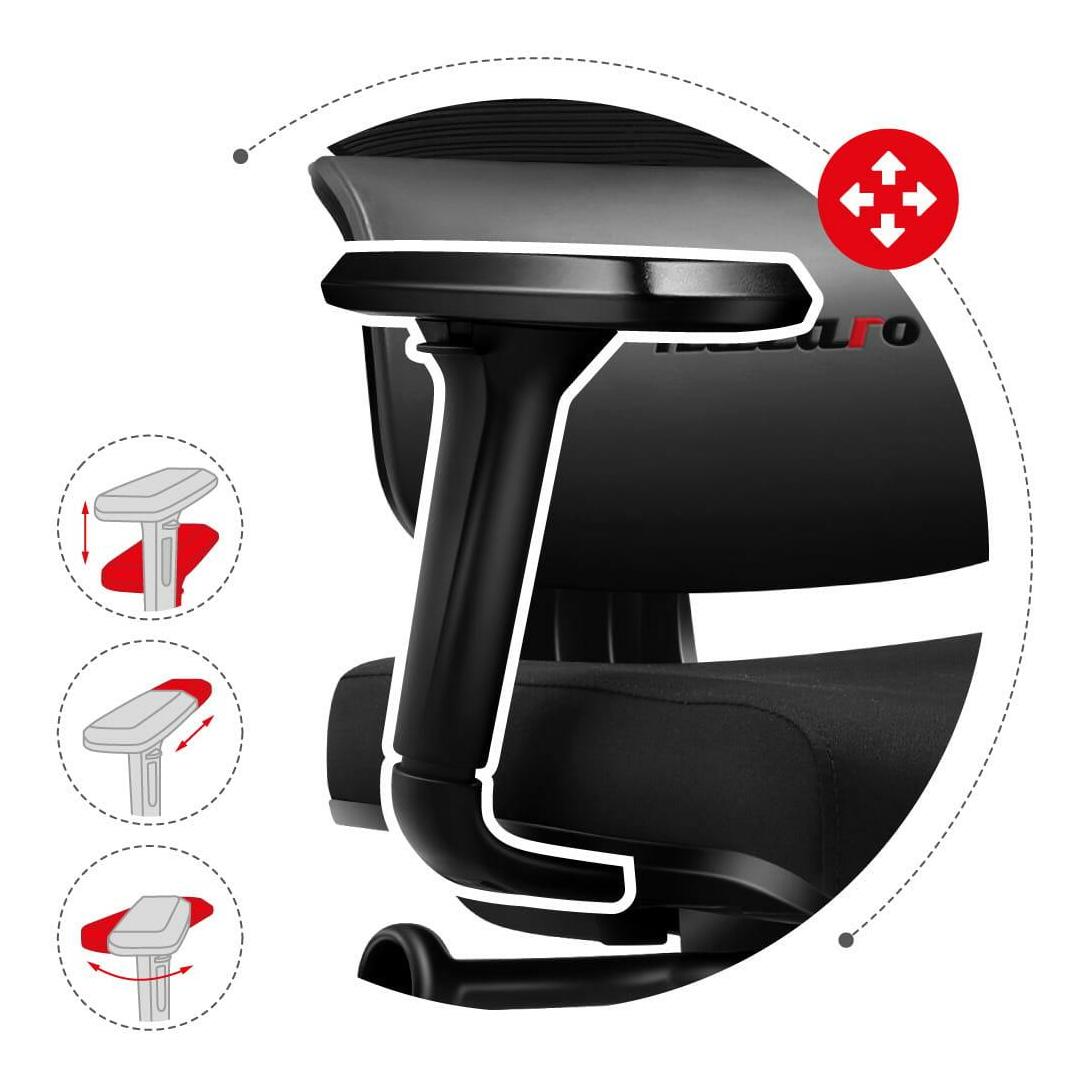 nastavení úhlu sklonu opěradla s aretací, nastavitelná výška opěrky hlavy a područky, ergonomické, nastavitelná výška sedáku, flexibilní bederní opěrka