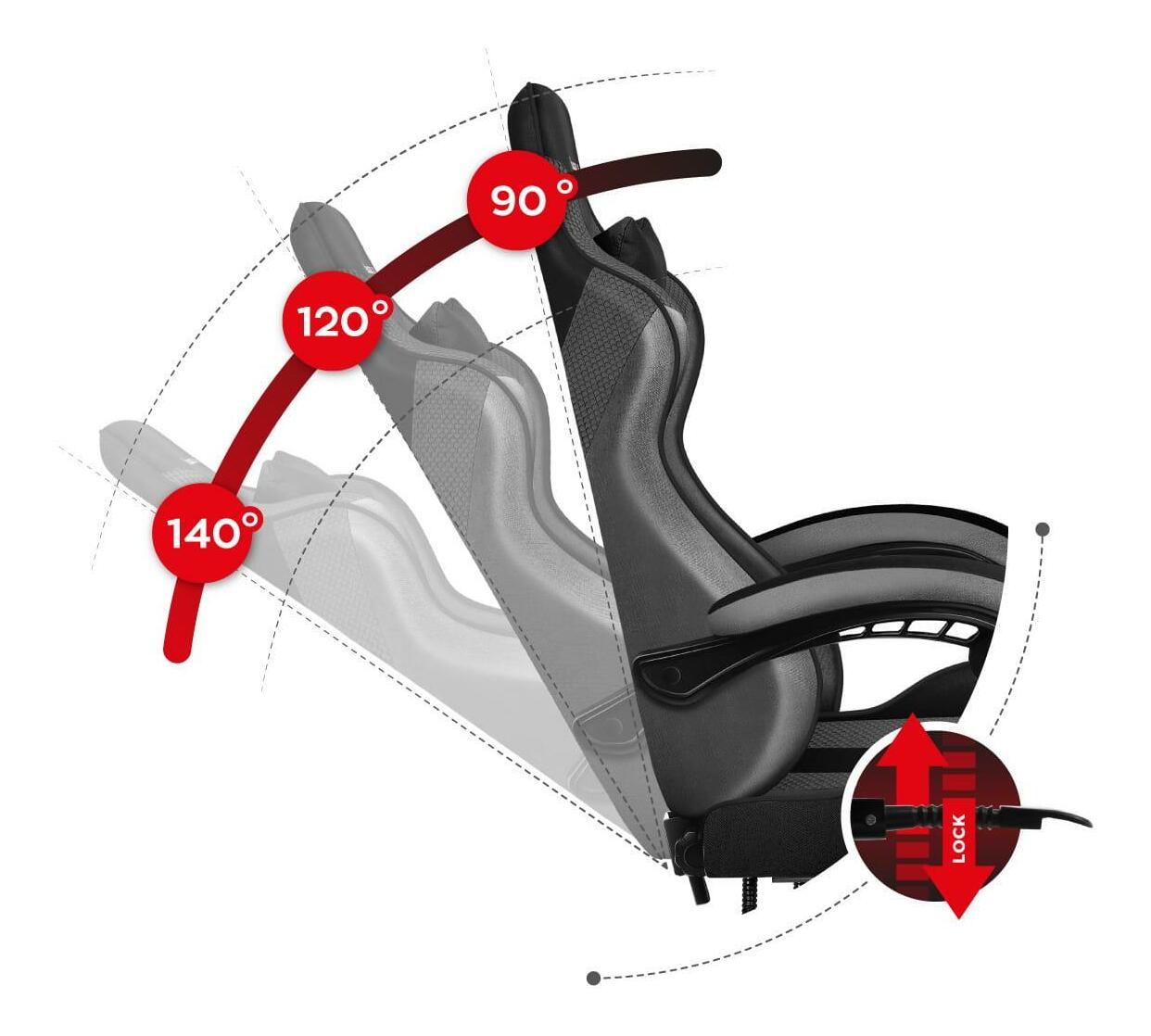 Ergonomické sedátko, sklopná opěrka nohou, sklopná opěrka zad – to je soubor funkcí, které vám umožní skutečně relaxovat i při práci nebo studiu. Křeslo vyrobené z prodyšných odolných látek má ještě jednu obrovskou výhodu – jednoduše vypadá skvěle. Sklopná opěrka nohou vám umožní pohodlně si natáhnout nohy, relaxovat a odpočívat. Skvěle funguje také funkce opěrky nohou v kombinaci se sklopným opěradlem. Funkce SeatRest umožňuje pohodlně ovládat míru sklonu opěradla pomocí páčky ukryté pod sedadlem. Bederní polštář s nastavitelnou výškou dle individuálních potřeb uživatele zajišťuje správnou polohu páteře. Odnímatelný polštář na krk dodává úlevu. Polyuretanovo-gumová dvojitá kolečka o průměru 50 mm ochrání podlahu před škrábanci a oděrkami.
