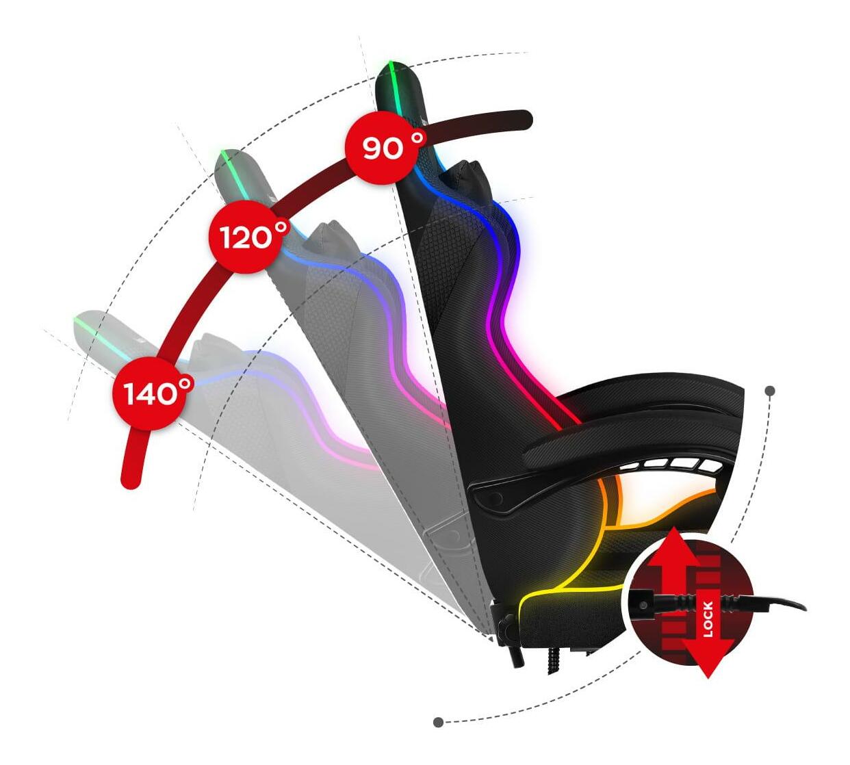 Ergonomické sedátko, sklopná opěrka nohou, sklopná opěrka zad – to je soubor funkcí, které vám umožní skutečně relaxovat i při práci nebo studiu. Křeslo vyrobené z prodyšných odolných látek má ještě jednu obrovskou výhodu – jednoduše vypadá skvěle. Sklopná opěrka nohou vám umožní pohodlně si natáhnout nohy, relaxovat a odpočívat. Skvěle funguje také funkce opěrky nohou v kombinaci se sklopným opěradlem. Funkce SeatRest umožňuje pohodlně ovládat míru sklonu opěradla pomocí páčky ukryté pod sedadlem. Bederní polštář s nastavitelnou výškou dle individuálních potřeb uživatele zajišťuje správnou polohu páteře. Odnímatelný polštář na krk dodává úlevu. Polyuretanovo-gumová dvojitá kolečka o průměru 50 mm ochrání podlahu před škrábanci a oděrkami. RGB LED osvětlení promění nejen křeslo, ale i celý váš pokoj na prostor přímo ze světa her. Bezdrátové dálkové ovládání, které je součástí soupravy, vám umožňuje libovolný výběr barev osvětlení a speciálních světelných efektů. Ovládání je intuitivní a nebude dělat sebemenší problém ani dítěti.