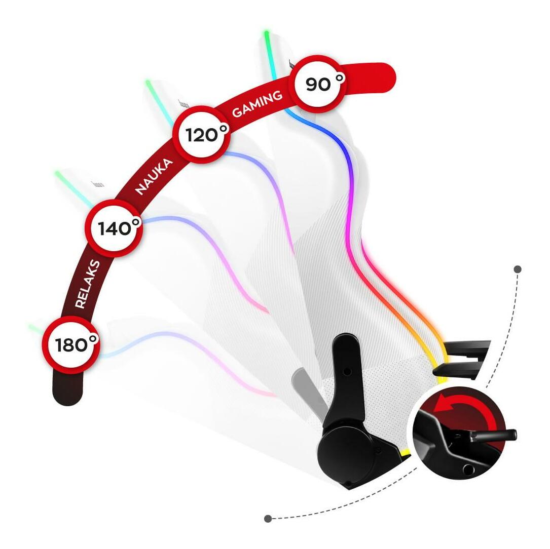 Herní křeslo bylo vytvořeno pro hráče a fanoušky e-sportu, kteří si cení pohodlí, dobrého stylu a chtějí posílit svou vášeň pomocí jedinečného vybavení. Odolná konstrukce a maximální zatížení 130 kg zajišťuje bezpečnost i při těch nejvzrušivějších hrách. Síťovina a pěna umožňují průchod vzduchu, díky čemuž herní křeslo zaručuje pohodlí v chladných i horkých dnech. Krční svalový polštář je funkční opěrka hlavy, která vám pomůže vyhnout se nepříjemné bolesti. Bederní polštář podporuje správné polohování spodní části páteře. Vaše záda zůstávají ve zdravé poloze během dlouhých herních sezení i při práci před obrazovkou počítače. Technologie Siderest zvyšuje pohodlí hráče při dlouhém sezení. Opěradlo sedáku lze naklonit o 90 stupňů do ležící polohy. Mechanismus Tilt Plus a houpací funkce Softlex zajišťují maximální komfort díky možnosti houpání. Ovládání jednou rukou pomocí páky umístěné pod sedadlem. Nastavitelné područky snižují zátěž na ramena a páteř. Pogumovaná kolečka nepoškrábají podlahu a umožňují plynulý pohyb židle. RGB LED osvětlení se speciálními efekty zaručuje mimořádné vizuální efekty a jedinečný herní zážitek. Obsahuje 16 různých barev a doplňkové efekty, které si můžete sami měnit. Bezdrátové dálkové ovládání pro pohodlné RGB LED ovládání.