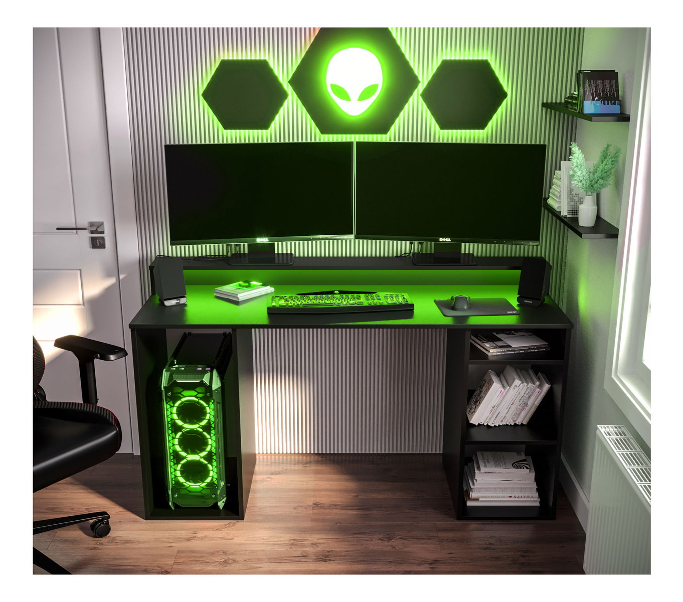 ZobrazitHerní PC stolek Garrick 1 (černý) s LED RGB osvětlením je ideální pro hráče, kteří hledají optimální pracovní plochu. S výškou 90 cm, šířkou 138 cm a hloubkou 50 cm nabízí dostatečně velký prostor pro většinu herních sad. Matné černé povrchy dělají stolek elegantním a jednoduchým vzhledem, který se hodí do každého pokoje. Navíc, LED RGB osvětlení dodává stolku moderní vzhled a vytváří skvělou atmosféru pro hraní. Garrick 1 je vyroben z kvalitních materiálů, které zajišťují dlouhou životnost a trvanlivost stolku.