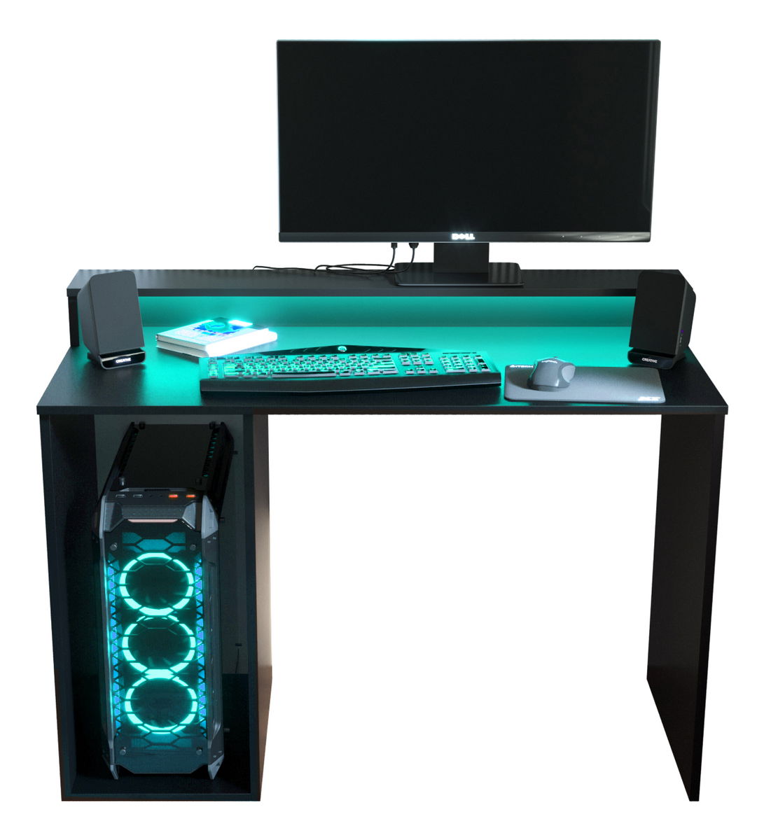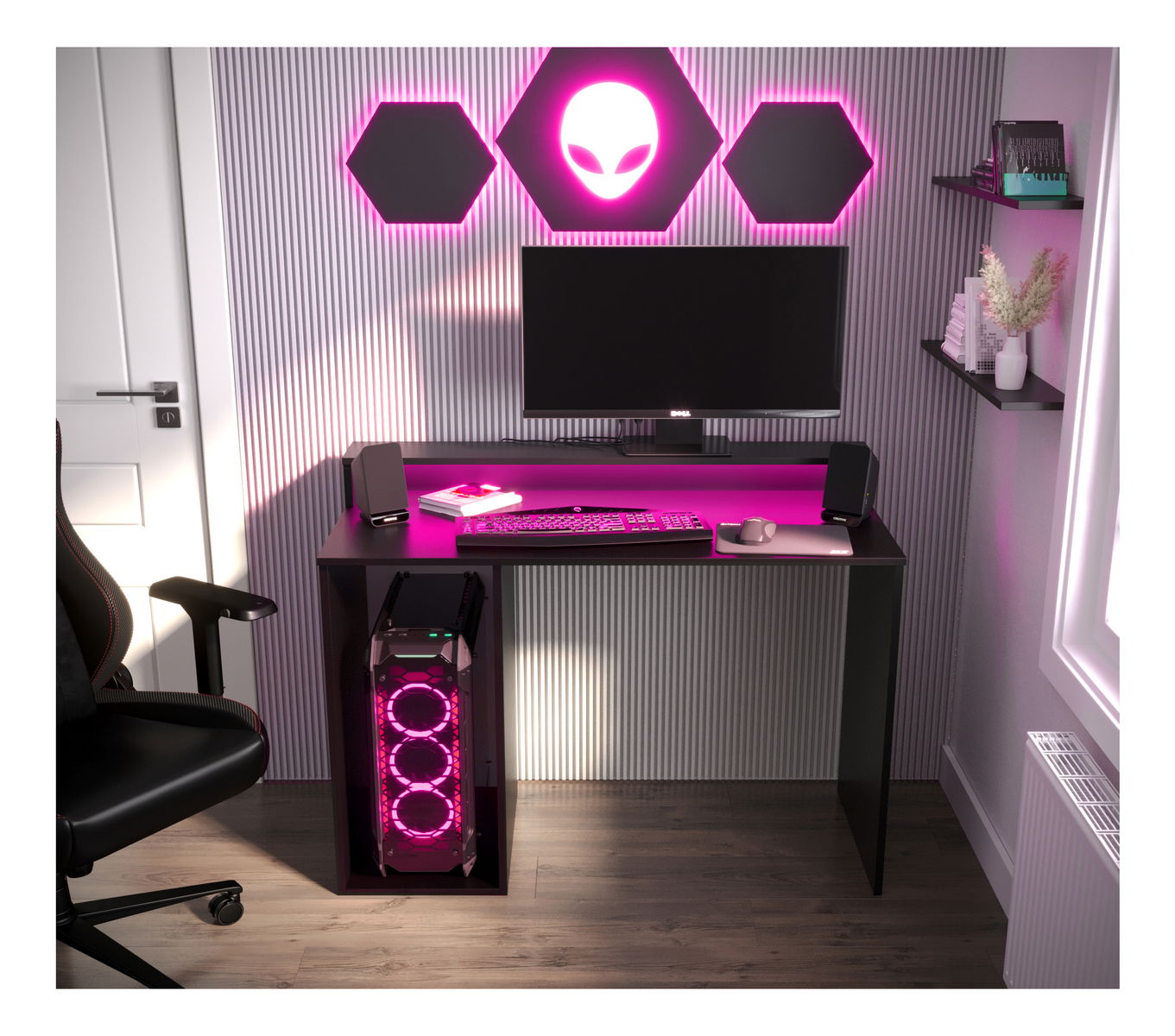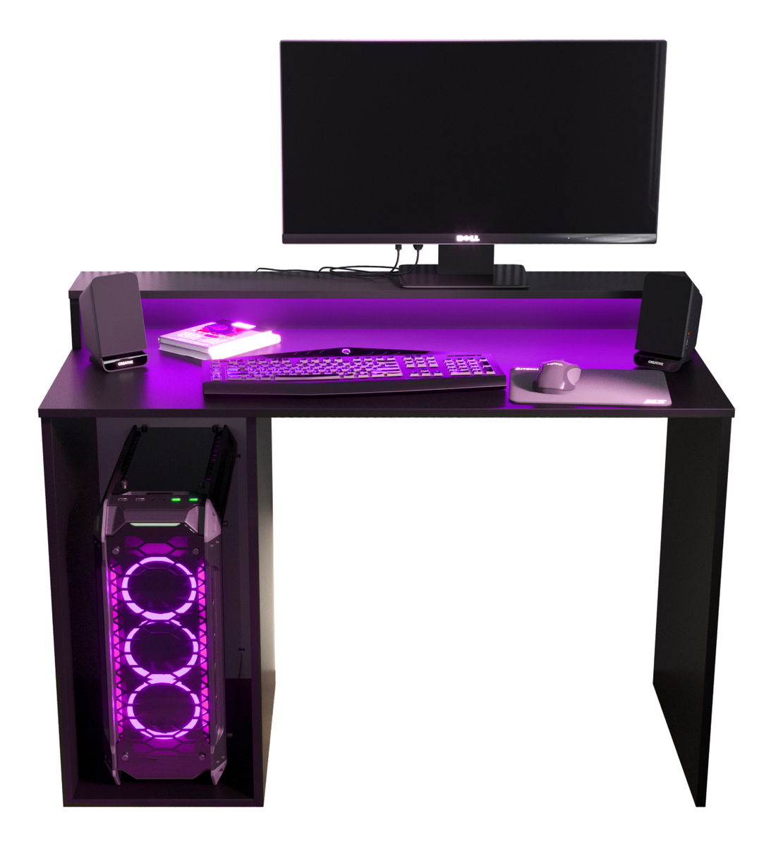 ZobrazitHerní PC stolek - Garrick 2 (černý) (s LED RGB osvětlením) je ideální pro všechny nadšence počítačových her. S jeho výškou 90 cm, šířkou 106 cm a hloubkou 48 cm poskytuje dostatek prostoru pro monitor, klávesnici, myš a další herní příslušenství. Stolek je vyroben z kvalitních materiálů, které zaručují jeho pevnost a dlouhou životnost. K tomu jsou přidána LED RGB světla, která vytvářejí dokonalý herní zážitek. Černá matná barva dodává stolku sofistikovaný a moderní vzhled. Garrick 2 je proto vynikající volbou pro každého, kdo hledá skvělý herní stolek s LED osvětlením.