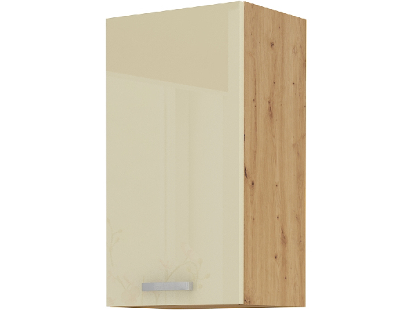 Horní kuchyňská skříňka Arryn 40 G-72 1F (dub artisan + lesk krémový) je vysoká 71,5 cm, široká 40 cm a hluboká 31 cm. Je vyrobena z laminované dřevotřísky o tloušťce 16 mm a má lesklý krémový přední panel z MDF o tloušťce 16 mm a ABS hranou. Úchyty jsou z plastu a mají délku 192 mm. Skříňka má tichý dojezd pro pohodlné otevírání a zavírání.