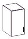 Horní kuchyňská skříňka s dvířky a tenkou ručkou v stříbrné barvě.