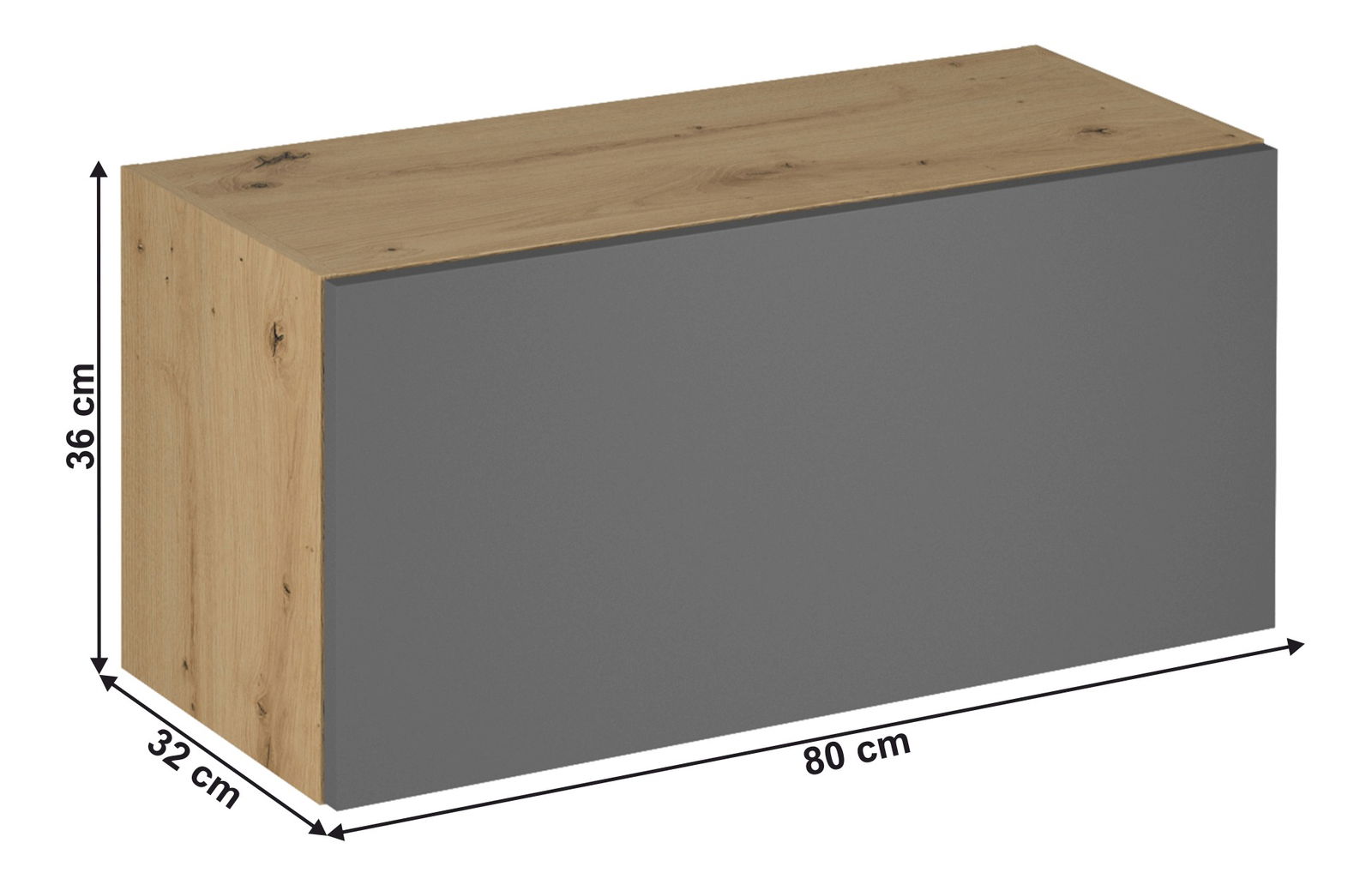 Kuchyňská skříňka G80K Langari v dub artisan a šedé matné barvě má výšku 36 cm, šířku 80 cm a hloubku 32 cm. Skříňka je vybavena systémem PUSH UP a dodává se s úchytkami, přičemž dvířka i zásuvky mají systém tichého dorazu. Pracovní deska na spodních skříňkách není součástí. Materiál skříňky je DTD laminovaná a její tloušťka je 15 mm. Skříňka je dodávána v demontu s možností volby otevírání dvířek systémem PUSH UP nebo úchytkami.