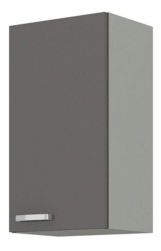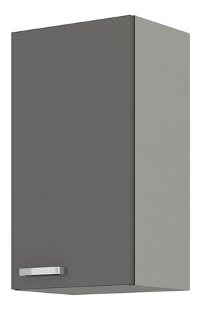Horní kuchyňská skříňka Gonir 40 G 72 1F je moderní a praktická skříňka z kuchyňského sektorového systému, o výšce 71,5 cm, šířce 40 cm a hloubce 31 cm. Skříňka je vyrobena z dřevotřísky laminované šedé barvy s ABS hranami a MDF předními panely šedého PET materiálu. Skříňka má kovové úchyty a systém tichého zavírání dvířek. Dvířka jsou univerzální a lze je namontovat vpravo i vlevo. Skříňka je součástí kuchyňské sestavy Gonir, která umožňuje zákazníkům výběr komponentů dle vlastní fantazie. Vnitřek skříně je v barvě bílá.