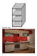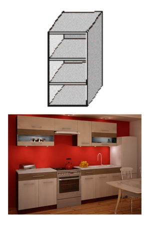 Dolní skříňky jsou dodávány včetně pracovní desky, jejíž výše je 28 mm. S pracovní deskou mají hloubku 60 cm, bez pracovní desky 45 cm.