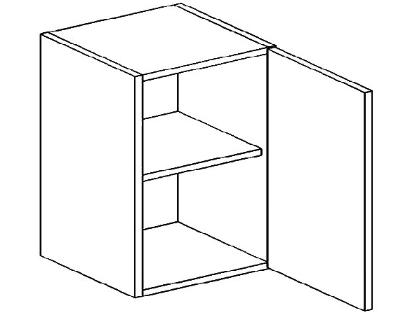 Horní kuchyňská skříňka s dvířky a úložným prostorem s poličkou. Vyobrazena skříňka je s pravým otevíráním dvířek.