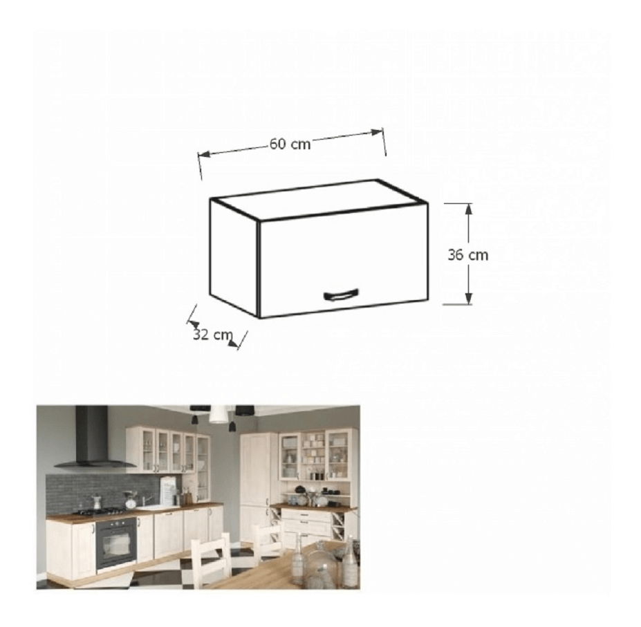 Horní kuchyňská skříňka nad digestoř s dvířky s výklopem. Kuchyňský systém v provensálském stylu, korpus je vyroben z kvalitní laminované dřevotřísky v barevném provedení sosna skandinávská s doplňkovým dekorem dubu divokého. Korpus je bílé barvy a přední dvířka jsou krémové.