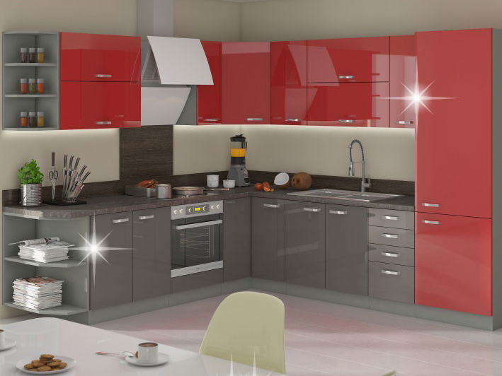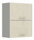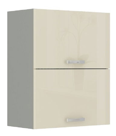 Horní kuchyňská skříňka šíře 60 cm a výšky 71,5 cm se dvěma dvířky umístěné nad sebou otevírající se na výklopném kování. Zavírání dvířek je vybaveno moderním tichým systémem zavírání, úchyty jsou kovové. Materiál je MDF, korpus je šedý, dvířka jsou ve vysokém lesku červeném nebo krémovém.