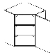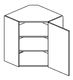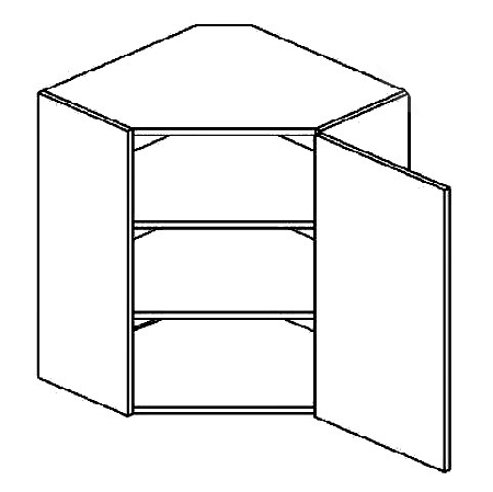 Horní kuchyňská skříňka rohová s dvířky a dvěma poličkami v úložném prostoru. Vyobrazena skříňka je s pravým otevíráním dvířek.