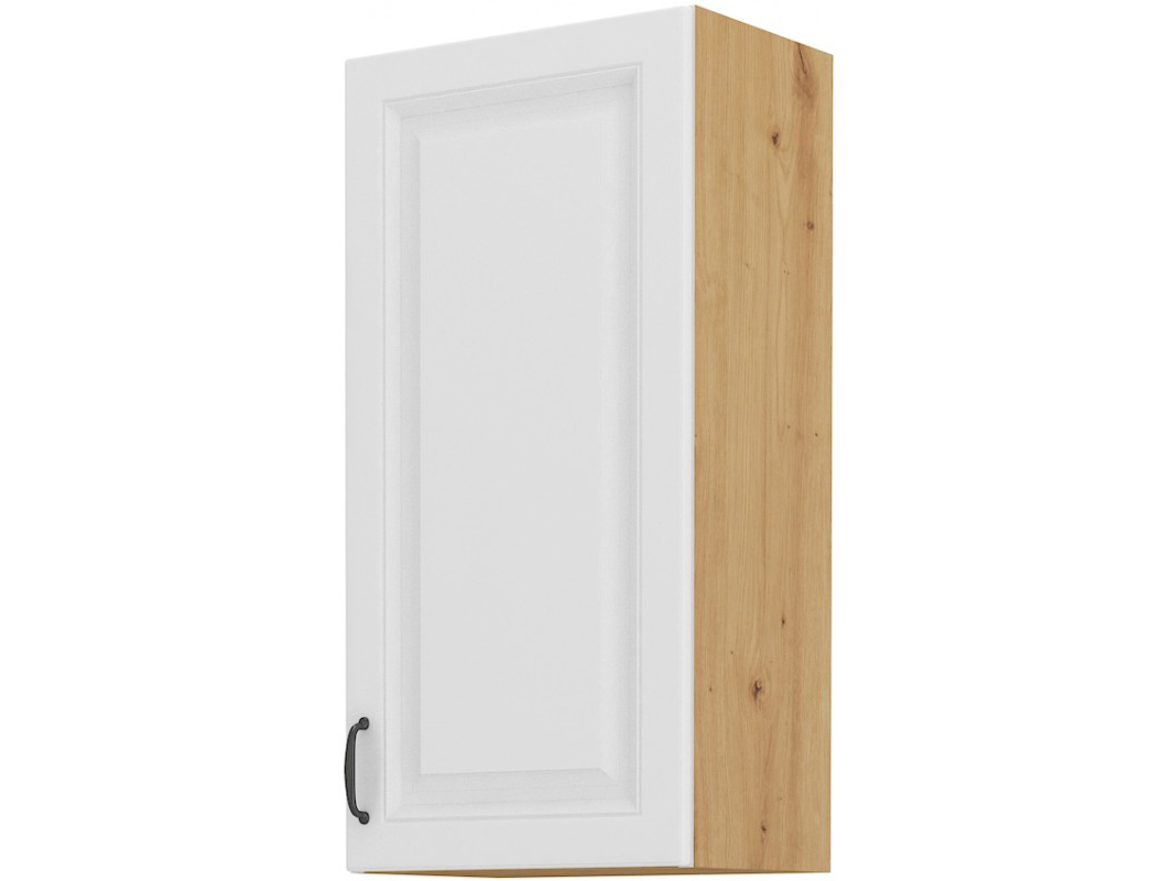 Horní kuchyňská skříňka Sheila 40 G 90 1F je moderní skříňka z kuchyňského sektorového systému o výšce 90 cm, šířce 40 cm a hloubce 31 cm. Je vyrobena z dřevotřísky laminované s dubovým artisan korpusem a bílým MDF frontou. Součástí skříňky jsou kovové úchyty a systém tichého zavírání. Dvířka jsou univerzální a mohou být otevřena vlevo i vpravo. Skříňka má bílý interiér a slepé vyvrtané otvory pro rukojeť. Sérii Sheila tvoří také další varianty skříněk a regálů, které se perfektně hodí k rustikální kuchyni s moderními prvky.
