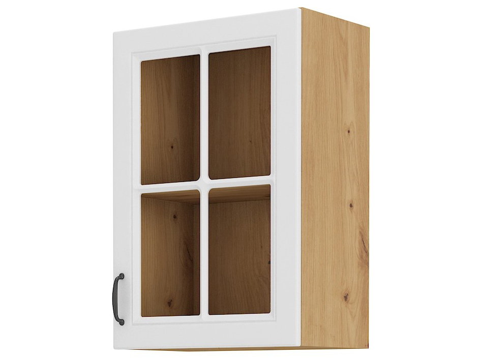 Horní kuchyňská skříňka Sheila 40 GS 72 1F (dub artisan + bílá) je moderní horní skříňka z kuchyňského sektorového systému s výplní ze skla a kovovými úchyty. Skříňka má korpus z dřevotřísky laminované s dubovým finišem a přední MDF desku v matné bílé barvě. Otevírání dvířek je možné vlevo i vpravo a skříňka disponuje systémem tichého zavírání. Skříňka je součástí kuchyňské sestavy Sheila, která vám umožní sestavit si kuchyni podle vašich představ.