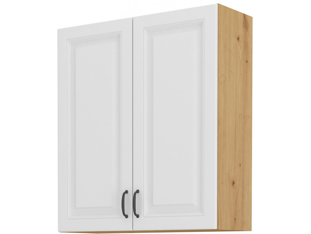 Horní kuchyňská skříňka Sheila 80 G 90 2F je moderní dvoudveřová skříňka o výšce 90 cm, šířce 80 cm a hloubce 31 cm. Je vyrobena z dřevotřísky laminované v dub artisan pro korpus a bílá matná MDF deska pro přední dveře s kovovými úchyty a ABS hranami. Skříňka obsahuje systém tichého zavírání a možnost otevírání dvířek vpravo i vlevo. Bílý interiér skříně a slepé vyvrtané otvory pro rukojeť jsou další vlastnosti, které ji dělají ideální pro každou moderní kuchyni.
