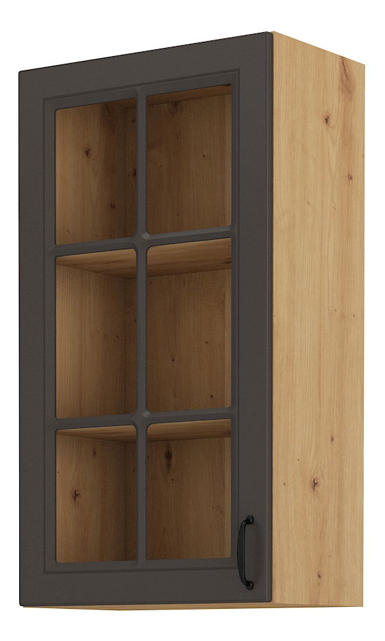 Horní kuchyňská skříňka Sheila GR 40 GS 90 1F (dub artisan + grafit) je moderní skříňka z kuchyňského sektorového systému o výšce 90 cm, šířce 40 cm a hloubce 31 cm. Je vyrobena z dřevotřísky laminované s dubovým artisanem a přední MDF deskou v grafitové barvě. Skříňka má skleněnou výplň a kovové úchyty o rozměru 192 mm. Systém tichého zavírání zajišťuje příjemné a bezproblémové uzavření skříňky. Dvířka skříněk jsou univerzální a lze je montovat na pravé i levé straně. Kuchyňská sestava Sheila nabízí také další varianty skříněk a regálů, díky které si můžete sestavit kuchyni svých snů.