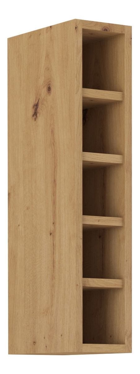 Horní kuchyňský regál Barb 15 G-72 OTW (dub artisan) je praktický otevřený regál z kuchyňského sektorového systému Barb, vhodný pro šálky a skleničky. Regál má moderní styl a výšku 72 cm, šířku 15 cm a hloubku 29 cm. Kuchyně Barb se skládá z modulárních skříněk v barvě dub artisan a truflová šedá. Kuchyňská linka má matný povrch, který nenápadně zamaskuje drobné nečistoty. K dispozici jsou dolní a horní skříňky, ale také skříňky pro vestavné spotřebiče jako například pečicí troubu či myčku nádobí. Kuchyni Barb si můžete zařídit také jako rohovou sestavu díky rohovým skříňkám. Materiál regálu je laminovaná dřevotřísková deska o tloušťce 16 mm a ABS hranami o tloušťce 1 mm. Regál má matnou povrchovou úpravu a nejsou součástí balení nožičky. Počet dvířek je uveden v technických parametrech produktu a pracovní deska není součástí ceny.