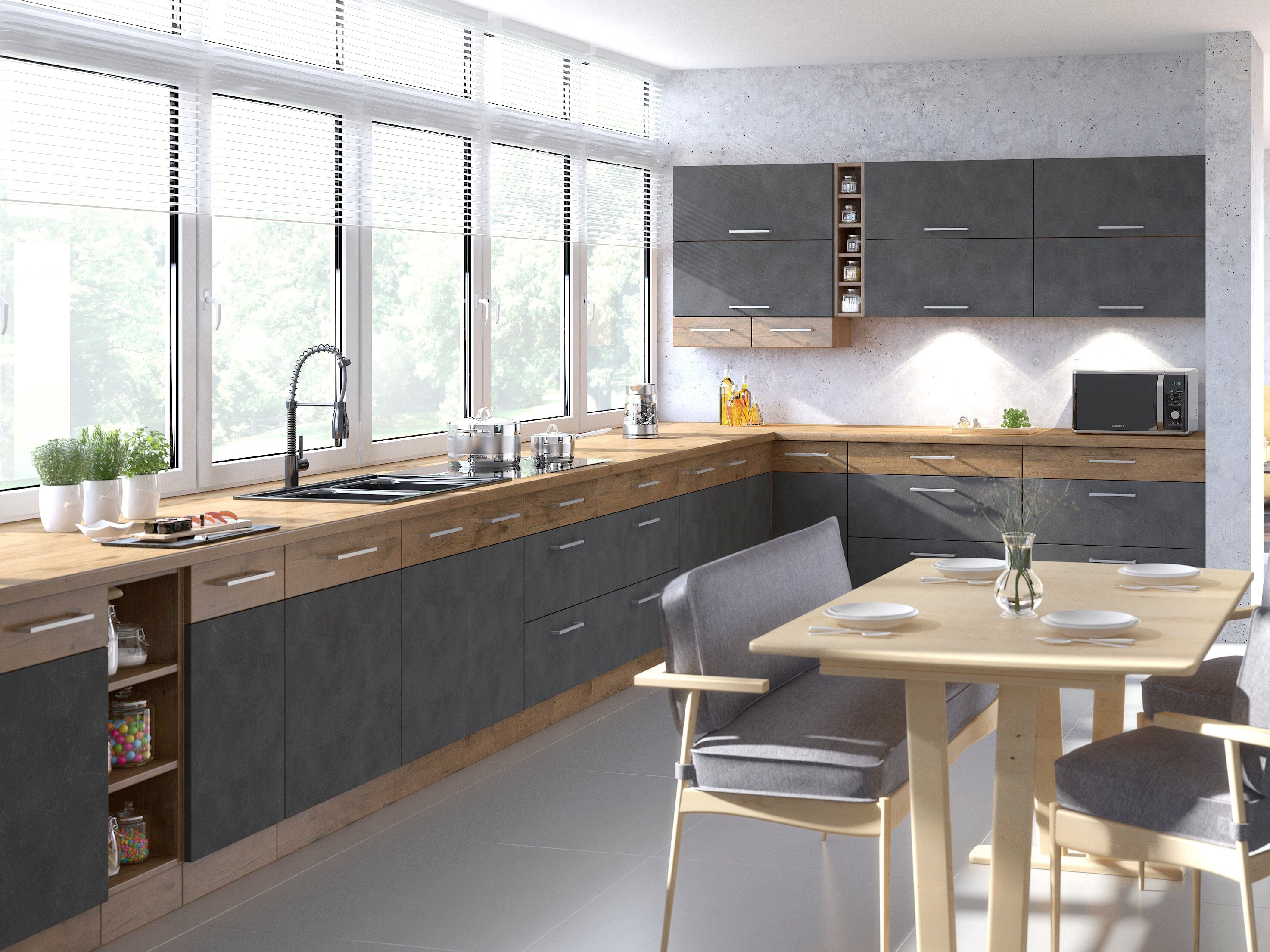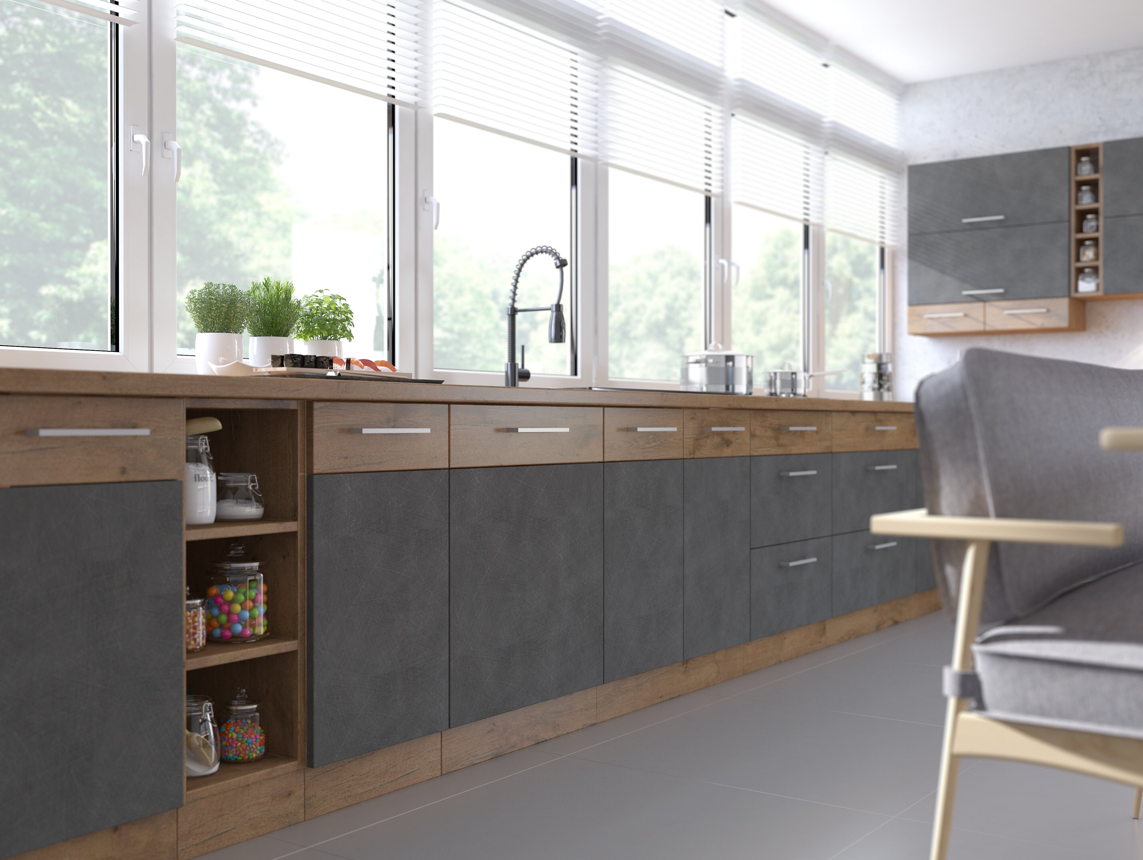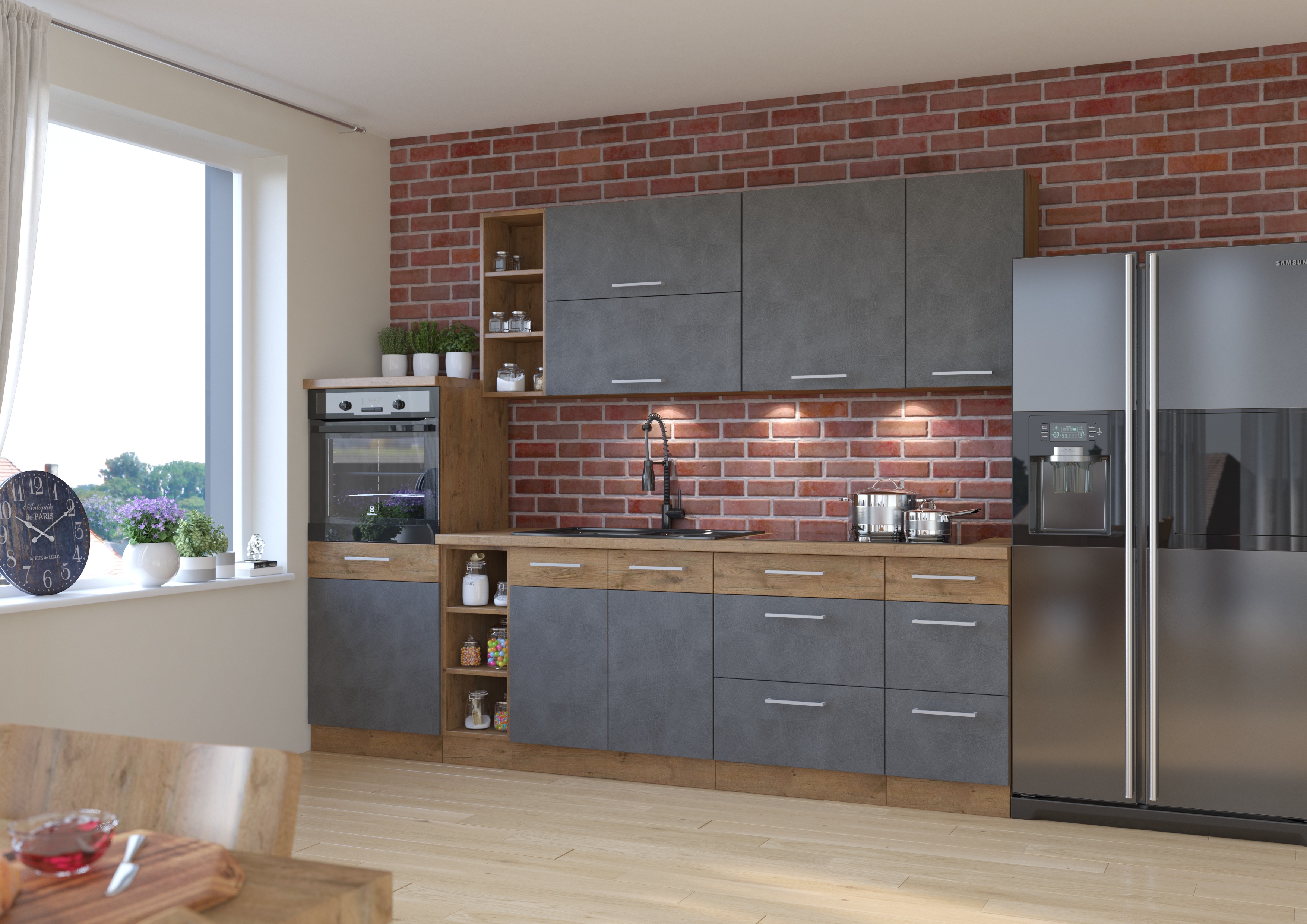 Staňte se pro tuto chvíli architektem a designér vlastní kuchyně. Nabízíme Vám směs designových skříněk v barvě bílá, šedá a bordó v kombinaci dubu Lancelot. Přáli jste si mít troubu v úrovni učí, nebo ji máte rádi v dole. Přáli jste si skříňky s výklopnými dvířky nebo klasicky doprava či doleva. Výběr je na vás a na vaší fantazii.