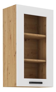 Čisté linie, stylový design a v neposlední řadě praktické řešení vaší kuchyně. To je kuchyňská linka Lesana. Stylová svým barevným provedením, praktická a funkční pro řadu výběru z různých horních a dolních skříněk. Lesana je vyrobena z kvalitní laminované dřevotřísky DTD, která je odolná vůči mechanickému poškození. Vyniká dlouhou životností, a to přece tak aktivní místnost, jakou je právě kuchyně, opravdu potřebuje. Čisté linie představují spojení bílého provedení s provedením dub artisan. Nabídka kuchyňské linky Lesana je opravdu bohatá. Najdete v ní zavřené i otevřené vrchní a spodní skříňky, vysokou potravinovou skříňku i příslušenství, jako například dvířka na myčku nádobí a pod. Spodní sektorové skříňky jsou dodávány včetně dolní lišty (sokla), bez pracovní desky. Pracovní desku o tloušťce 3,8 cm si můžete doobjednat. Horní skříňka Lesana 45 G-72 1F je s dvířky. Celá skříňka je v bílém barevném provedení. Skříňka obsahuje kovovou úchytku v černé barvě. Uvnitř se nachází police.