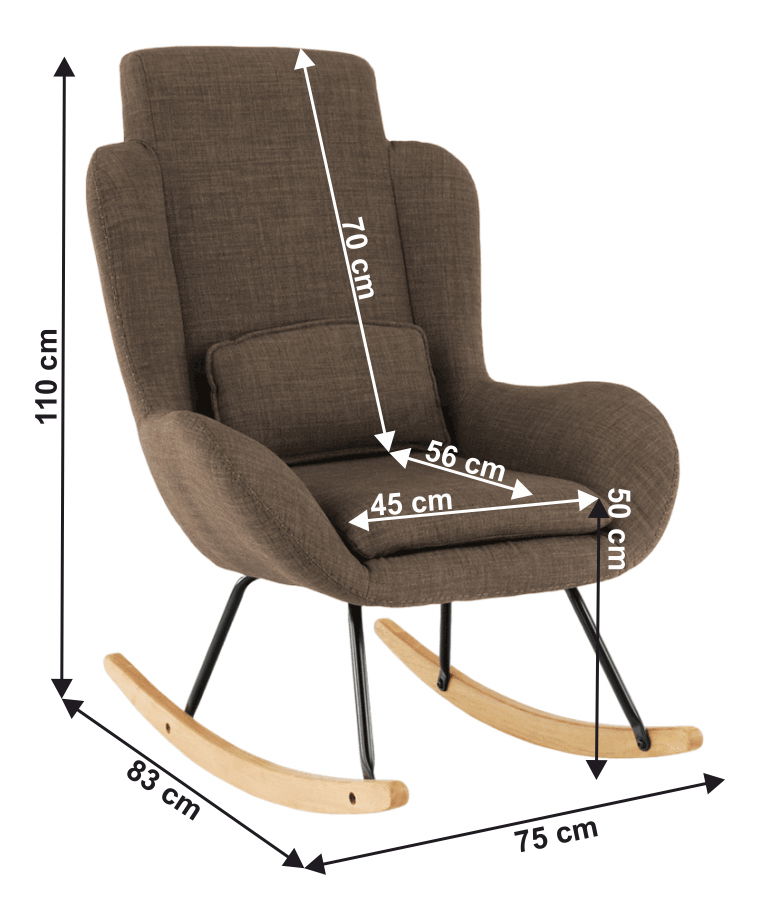 Houpací křeslo Caspera (černá) je čalouněný kus nábytku, který vám poskytne pohodlný relaxační zážitek. Křeslo má pevnou kovovou konstrukci a přichází s polštáři zahrnutými v ceně. K dispozici je v několika barvách, včetně hnědé. Materiál křesla je kombinace dřeva, kovu a textilie, která má odolnost až 90 000 oděrů. Výška sedu je 50 cm, šířka sedu 45 cm a hloubka sedu 56 cm. Výška opěradla je 70 cm a křeslo má nosnost až 120 kg. Křeslo je dodáváno v demontu a nohy jsou v černo-přírodní barvě.