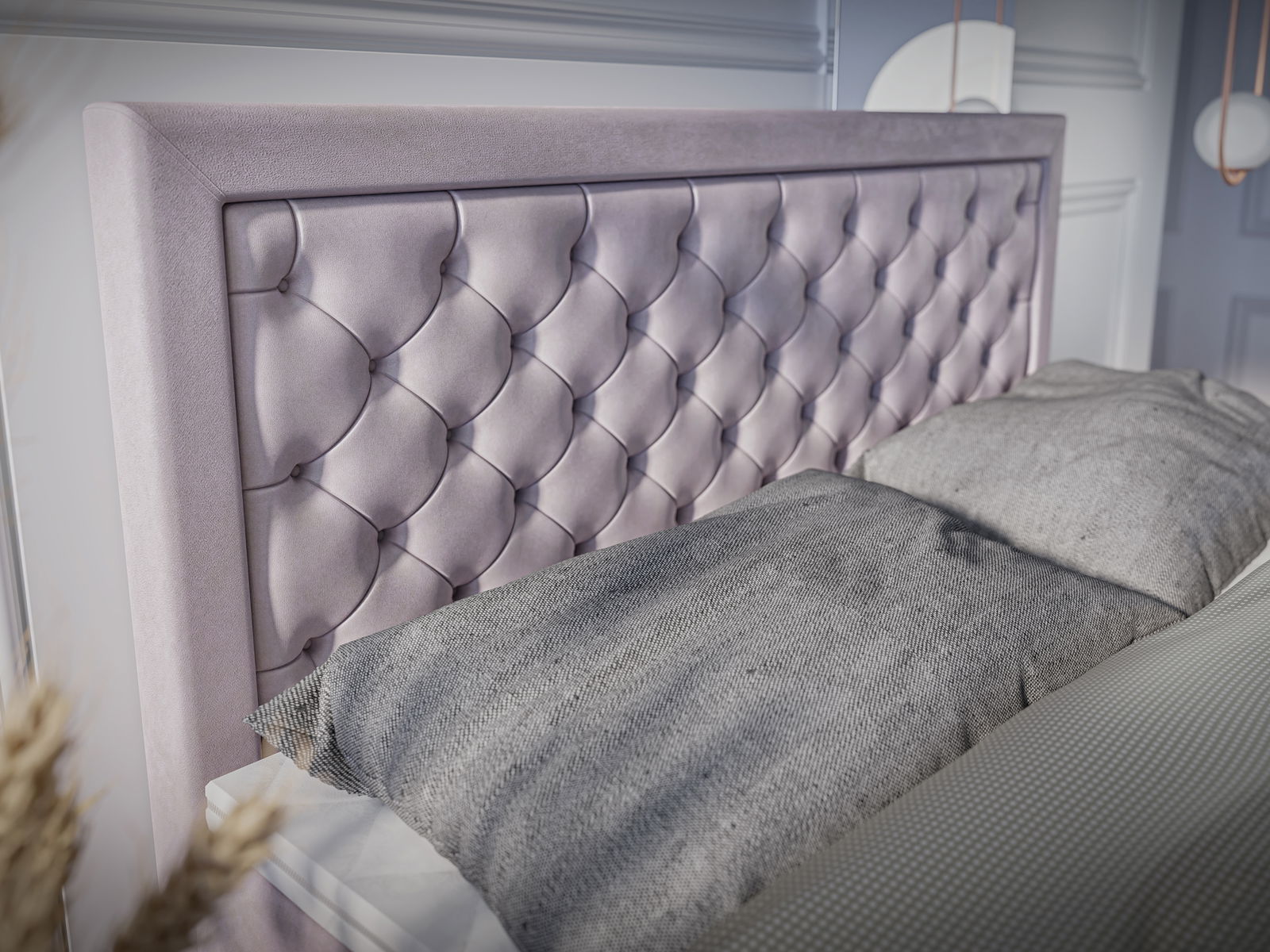 Kontinentální jednolůžková postel ve stylu glamour se sametovým povrchem stojící na nožičkách. Jednolůžková postel se skládá ze dvou samostatných lůžek, které lze vyklopit z boční strany. Po zvednutí matrací se zjeví úložný prostor na každé straně. Postel stojí na vyšších (13 cm) šedých kovových nožičkách. Na pružinových matracích je položen jeden velký topper. Víceúrovňová konstrukce je vysoká 53 cm. Vnitřek postele je z bílé desky o tloušťce 16 mm. Čelo postele je polstrované 3 cm široké a prošívané kolem celého rámu a ve středu do kosočtverce.