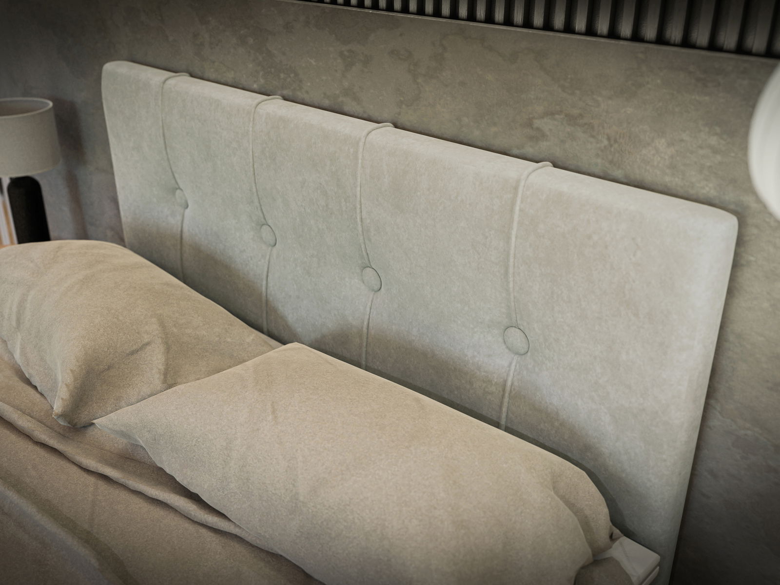 Klasická jednolůžková čalouněná postel se sametovým povrchem as ozdobným čelem Luffy. Jednolůžková kontinentální postel má dvě lůžka, která lze vyklápět bočním výklopem. Pod matracemi se nachází velký úložný prostor. Postel stojí na nízkých plastových nožičkách šedé barvy. K posteli přísluší i dvě pružinové matrace a jedna vrchní topper. Konstrukce postele je bílá o tloušťce 16 mm. Víceúrovňová konstrukce je vysoká 65 cm. Čelo postele je polstrované 3 cm široké s vertikálním prošíváním as knoflíky o průměru 5 cm.