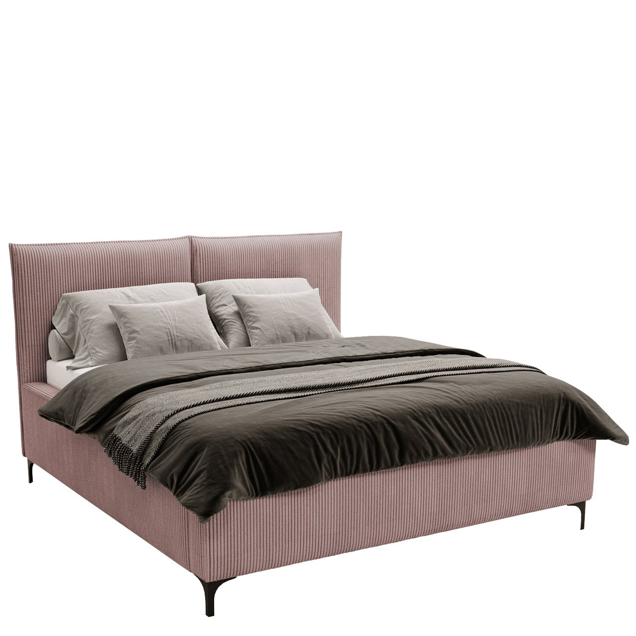 Postel je volně stojící - záda jsou potažena látkou (spojení prvků opěrky hlavy je viditelné)