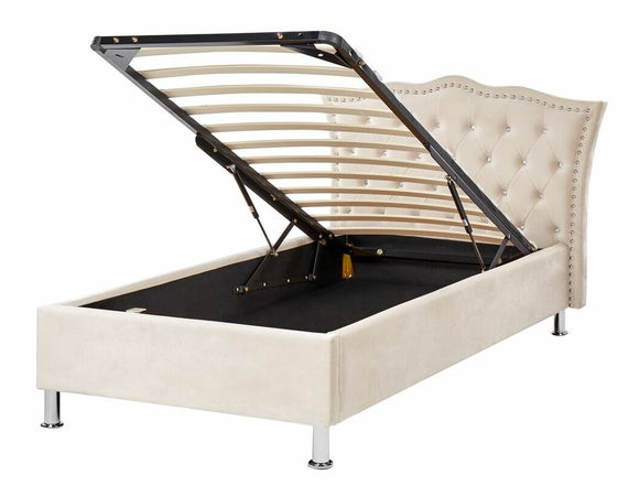 Dopřejte svému dítěti královský spánek v této okouzlující posteli. Je navržena v glamour stylu a v okamžiku promění ložnici nebo dětský pokoj ve stylový prostor. Čalounění z vysoce kvalitního sametu je elegantní, odolné a snadno se udržuje. Je doplněno prošíváním s lesklými knoflíčky a ozdobným lemováním na čele postele. Pevný rám poskytuje oporu matraci, zaručuje stabilitu a pohodlný spánek. Díky dostatku úložného prostoru pod roštem bude velmi snadné udržet pořádek v ložnici.