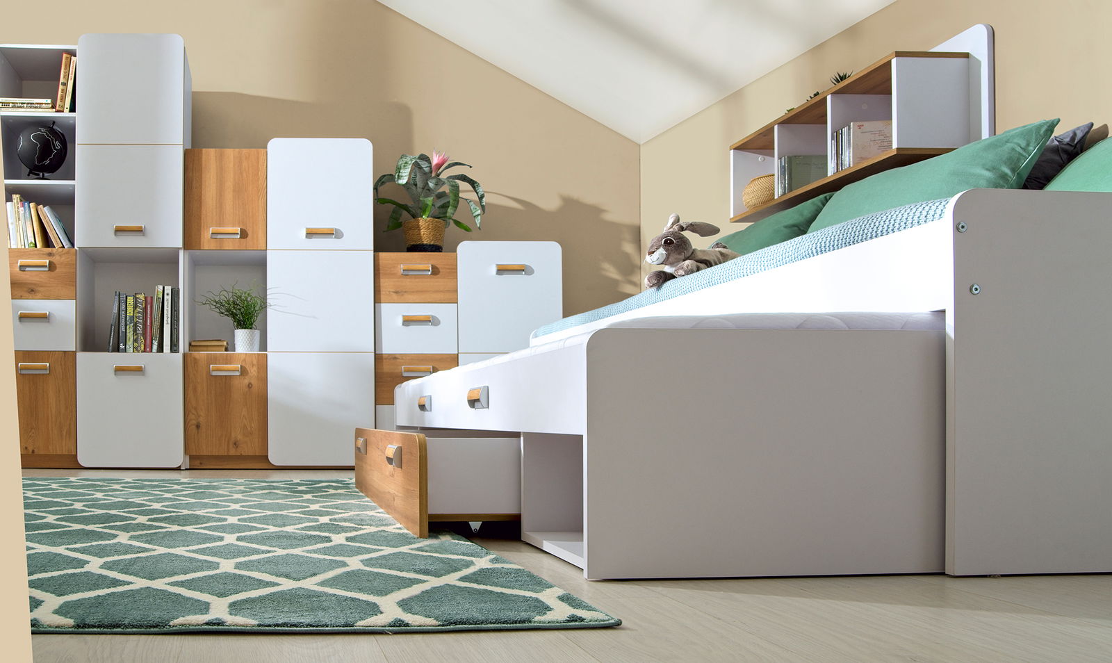 Jednolůžková postel s přitažlivým veselým designem vhodným do dětských a studentských pokojů. Čela postele mají zaoblené rohy. Postel má praktický úložný prostor v podobě výsuvné zásuvky, do které si odložíte ložní prádlo a jiné doplňky. Zásuvka má dva podlouhlé úchyty.