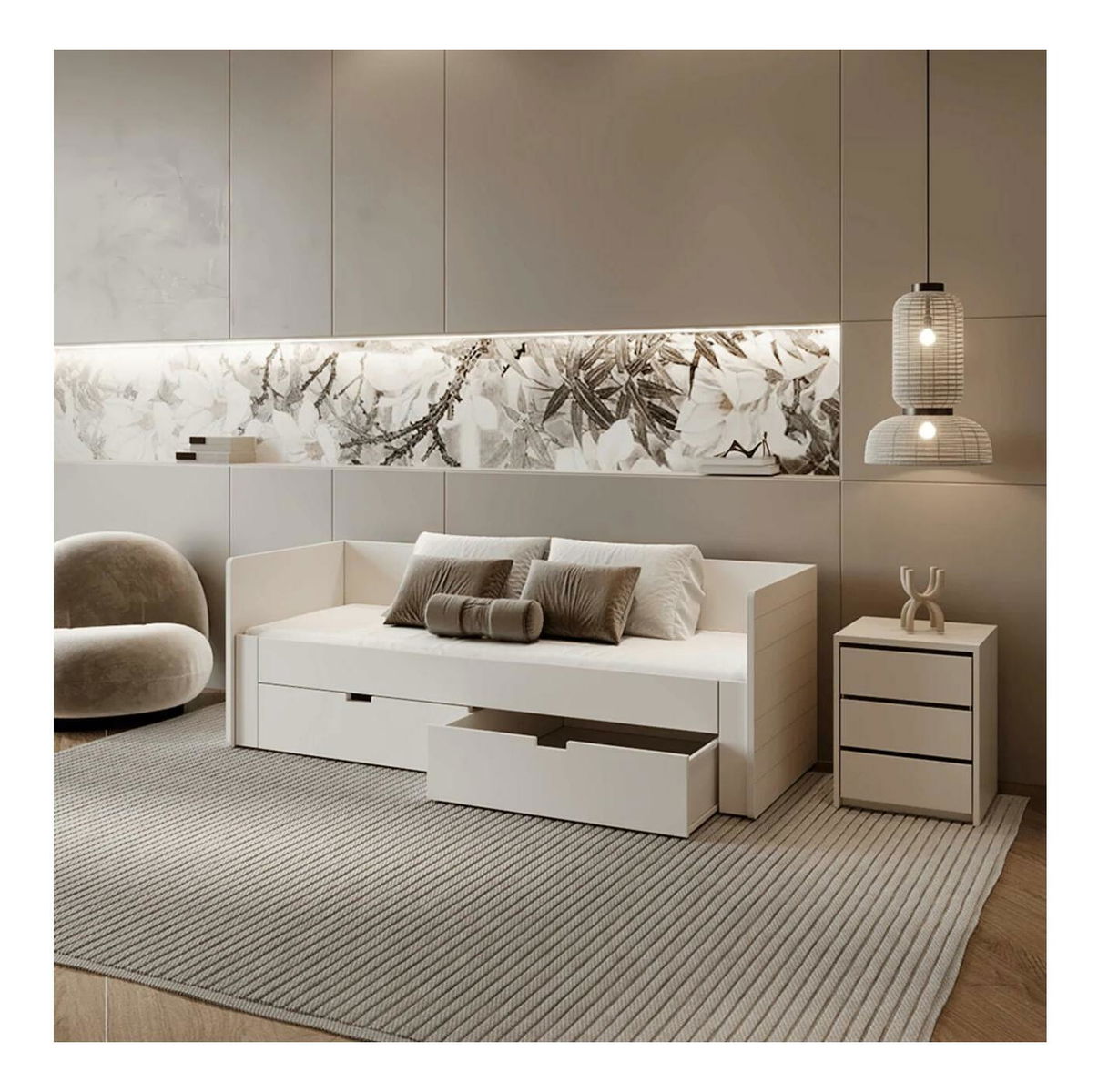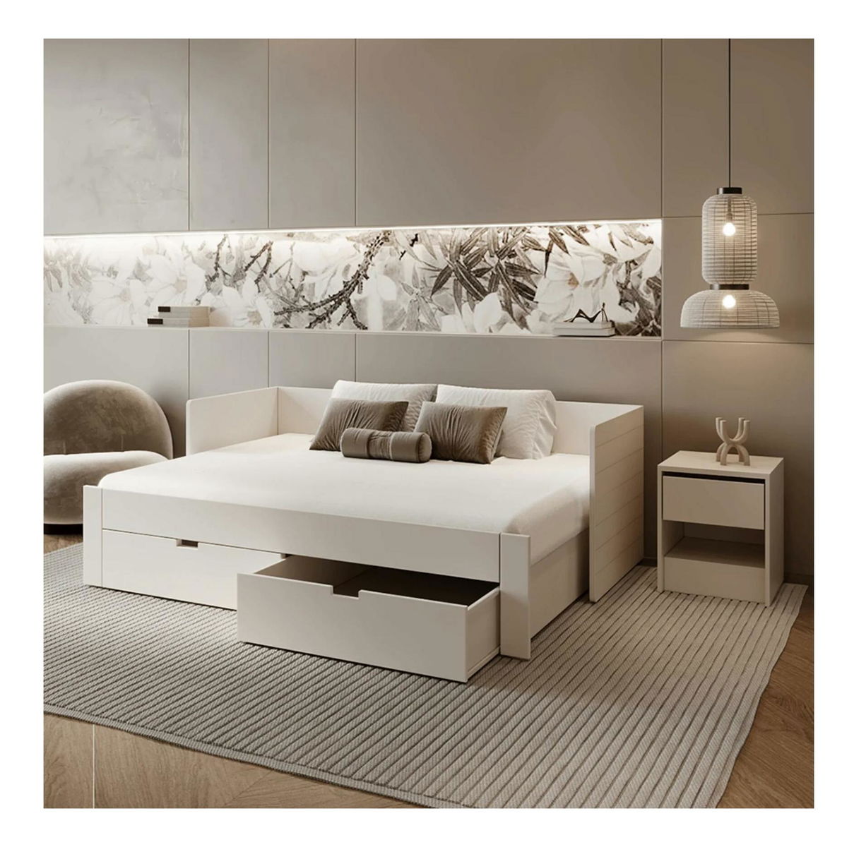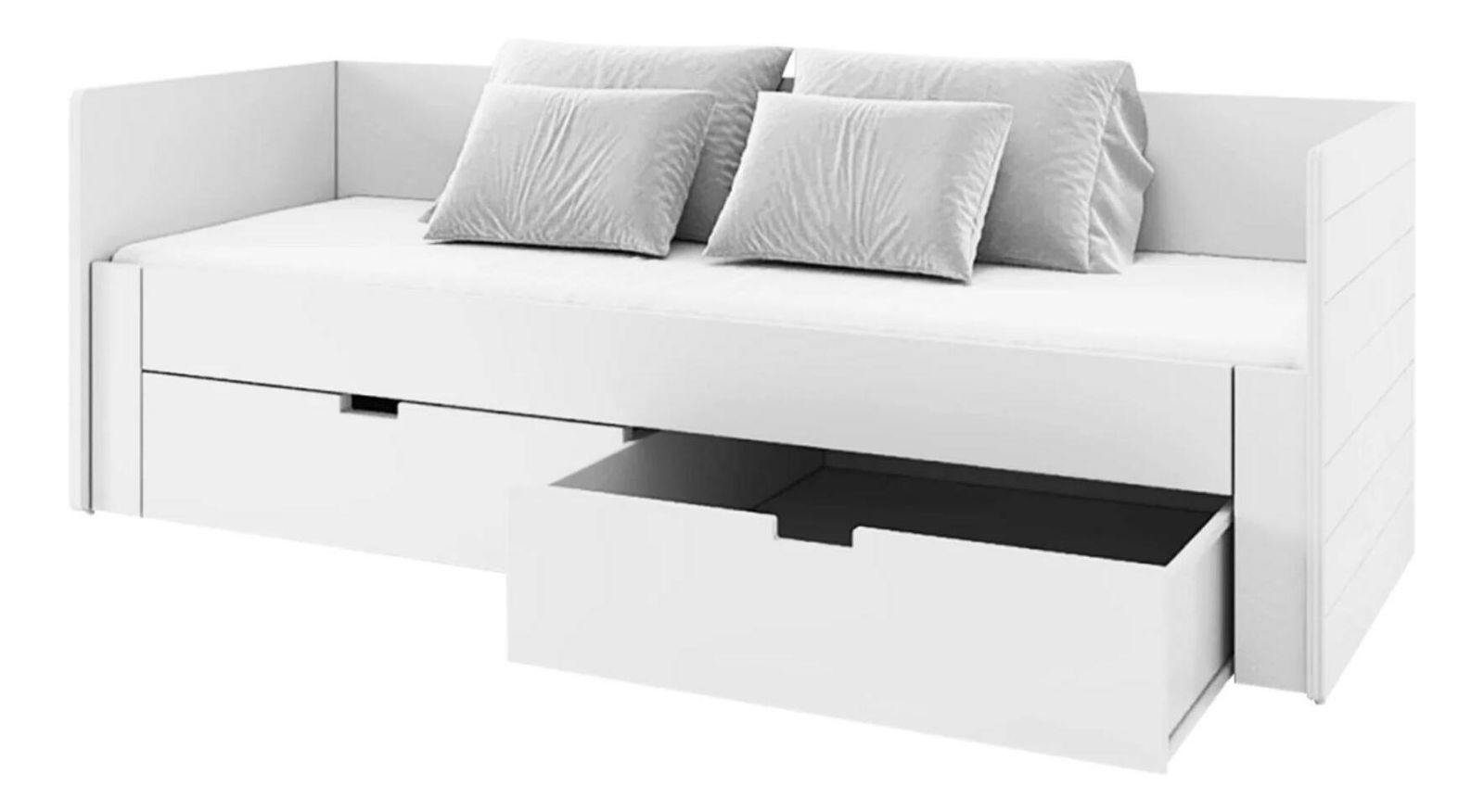 Tato praktická rozkládací postel je vyrobena z kvalitního kompozitního dřeva a MDF (plošně lisovaná třísková deska), což zaručuje její dlouhou životnost a odolnost. Ve složeném stavu nabízí plochu na spaní o rozměrech 90x200 cm, která se po rozložení zvětší na 180x200 cm, čímž poskytne dostatek místa pro dva lidi. Tloušťka materiálu kompozitního dřeva se pohybuje mezi 1,6 až 2,2 cm, zatímco MDF dosahuje tloušťky 2,2 cm. Výška přední bočnice od podlahy je 39 cm, což zajišťuje pohodlné vstávání z postele. Matrace je zapuštěna o 9 cm pod úroveň bočnice, což zajišťuje jeho stabilní uložení. Postel obsahuje také úložný prostor v podobě dvou zásuvek o vnitřním rozměru 85x53,5x17 cm, které unesou maximálně 5 kg. Celková nosnost postele je 90 kg na osobu. Součástí postele je rošt z borových latí, avšak matrace není součástí balení. Doporučená matrace má rozměr 90/180x200 cm a minimální výšku 12 cm. Postel je dodávána v demontovaném stavu a je připravena pro snadnou montáž.