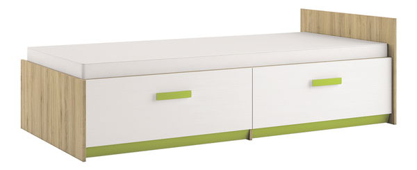 Postel s dvěma zásuvkami a roštem, které lze namontovat na levou nebo pravou stranu. Postel má ABS hrany, které mají dlouhou životnost, odolnost vůči oděru a estetický vzhled. Jsou odolné vůči vlhkosti, nedeformují se a ani neodlepují. Matrace není v ceně. Rozměr matrace pro tuto postel je 200x90 cm, který je možno dokoupit v našem e-shopu.