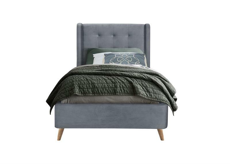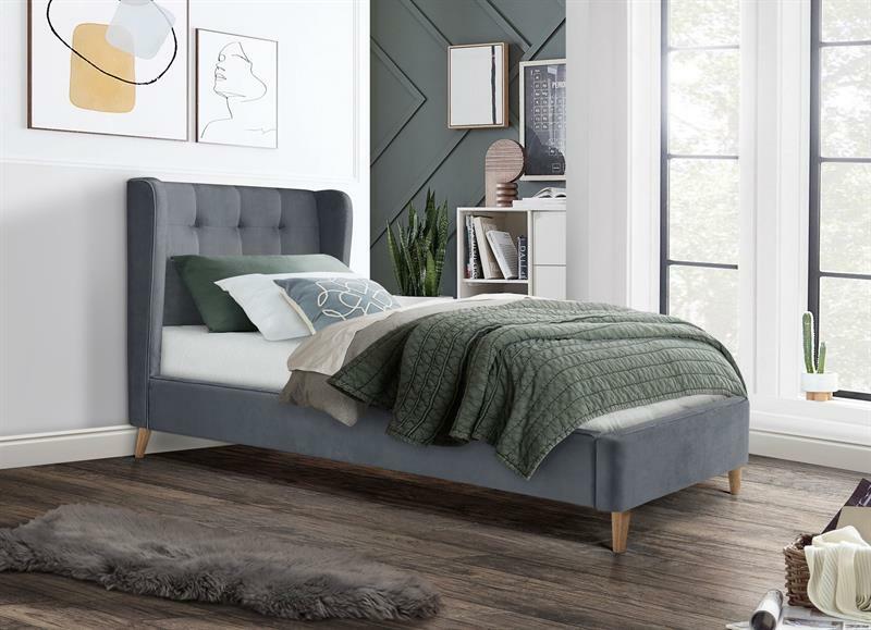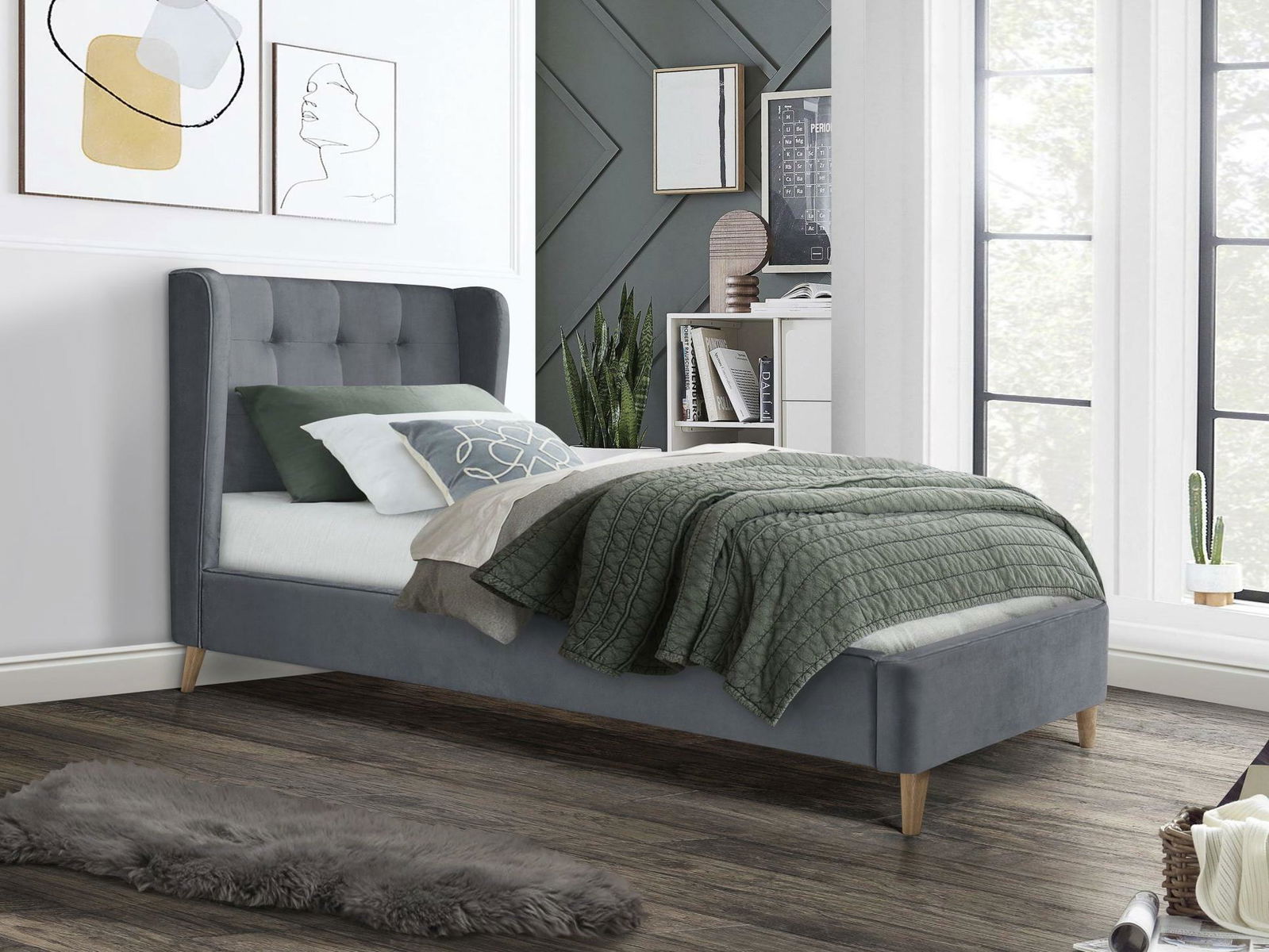 Jednolůžková čalouněná postel představuje stylový a pohodlný nábytek pro každou moderní ložnici. Postel je konstruována z laminované desky, která zajišťuje její pevnost a dlouhodobou odolnost. Povrch postele je pokryt měkkým sametovým materiálem, což přidává na luxusním vzhledu a poskytuje příjemný haptický zážitek. Přestože postel neobsahuje úložný prostor, její design je optimalizován pro pohodlí a estetiku s výškou sezení 35 cm. Postel stojí na pevných dřevěných nožičkách, které doplňují její elegantní vzhled a zaručují stabilní oporu. Součástí je rošt, ale matrace není zahrnuta, což umožňuje individuální výběr dle osobních preferencí a potřeb, s doporučeným rozměrem matrace 200x90 cm.