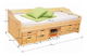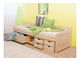 Víceúčelová postel Maxi Vám poskytne nejen pohodlný spánek, ale také dostatek úložného prostoru a bude i pěkným dekorativním prvkem díky kresbě dřeva kvalitního borovicového masivu. Úložný prostor je zajištěn jednou větší zásuvkou na kolečkách, čtyřmi malými zásuvkami a jedním otevřeným odkládacím prostorem. Výška postele od země po rošt je 36,7 cm. Plocha lůžka je 90 x 200 cm a je dodávána s laťkovým roštem, ale bez matrace. Ten si můžete vybrat z nabídky v našem internetovém obchodě.