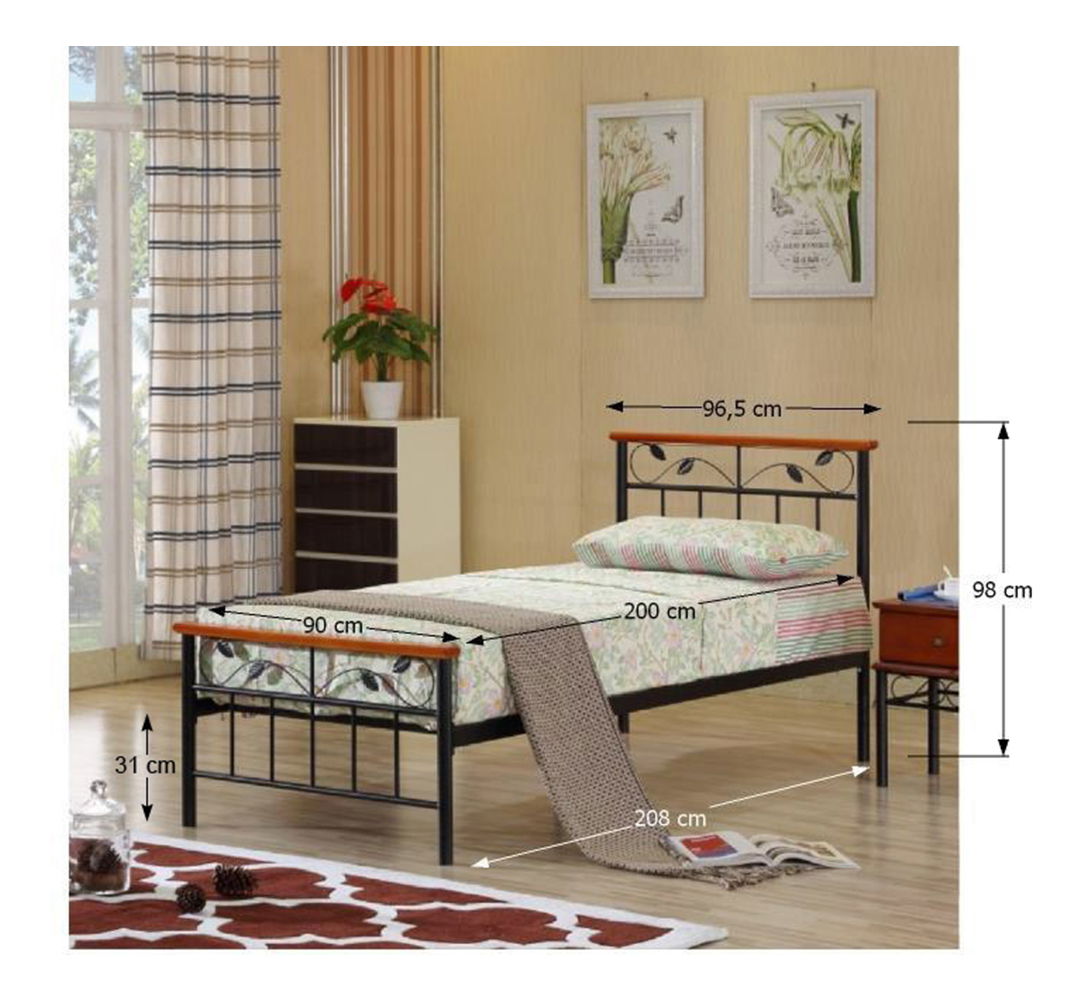 Jednolůžková postel 90 cm Myles 90 (černá + třešeň) o výšce 98 cm, šířce 96,5 cm a hloubce 208 cm je zárukou pohodlí a kvality. Její pevné kovové tělo v černé barvě dodává posteli život a eleganci. Postel je zdobená kreativními tvary s lístky, které spolu se dřevem v provedení třešeň vytvářejí dokonalý soulad přírodních a kovových materiálů. Její robustní tělo se vyrovná málokterému soupeři. Součástí postele je lamelový rošt, který zaručuje dostatečnou oporu a pohodlí během spánku. Užijte si maximální pohodu a styl s postelí Myles!