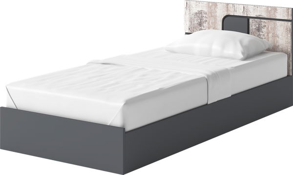 Stylová jednolůžkový postel s větším čelem, na kterém je výrazný designový prvek grafitové barvy. Na postel se doporučuje použít pružinová matrace.
