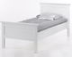 Jednolůžková postel s čelem u hlavy i u nohou. Postel stojí na tenkých nožkách a nemá úložný prostor.