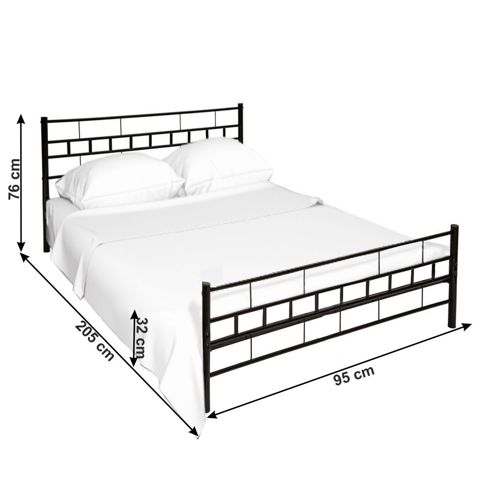 Jednolůžková postel Timlu 90 cm s roštem je vyrobena z kovu a má černou barvu. S rozměry 95x205x76 cm a spací plochou 90x200 cm poskytuje dostatek místa pro pohodlný spánek. Výška po roštu je 32 cm. Postel se dodává bez matrace, ale je možné si ji dokoupit. Kovová čela jsou také součástí nabídky. Postel je dodávána v demontu, ale její sestavení je jednoduché.