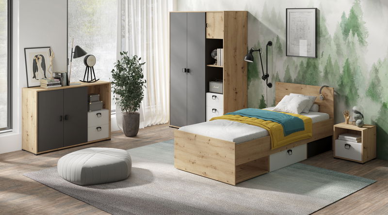 Tato jednolůžková postel je praktickým a funkčním řešením pro vaši ložnici. S rozměry spacího prostoru 90x200 cm poskytuje dostatek místa pro pohodlný spánek. Postel není vybavena úložným prostorem a disponuje roštem Rám postele je vyroben z 12 mm silné překližky, což zajišťuje pevnost a stabilitu. Kovové rukojeti a plastové nohy s kluzákovým typem zajišťují snadnou manipulaci a umožňují snadné přesouvání postele. Jedna zásuvka s GTV H-35 kuličkovými vodítky nabízí praktický úložný prostor pro odkládání různých položek. Kromě toho je k dispozici také jedna otevřená police, která může sloužit k umístění knih, časopisů nebo dekorativních předmětů. Papírové lemování dodává posteli estetický vzhled a chrání její hrany před poškozením.