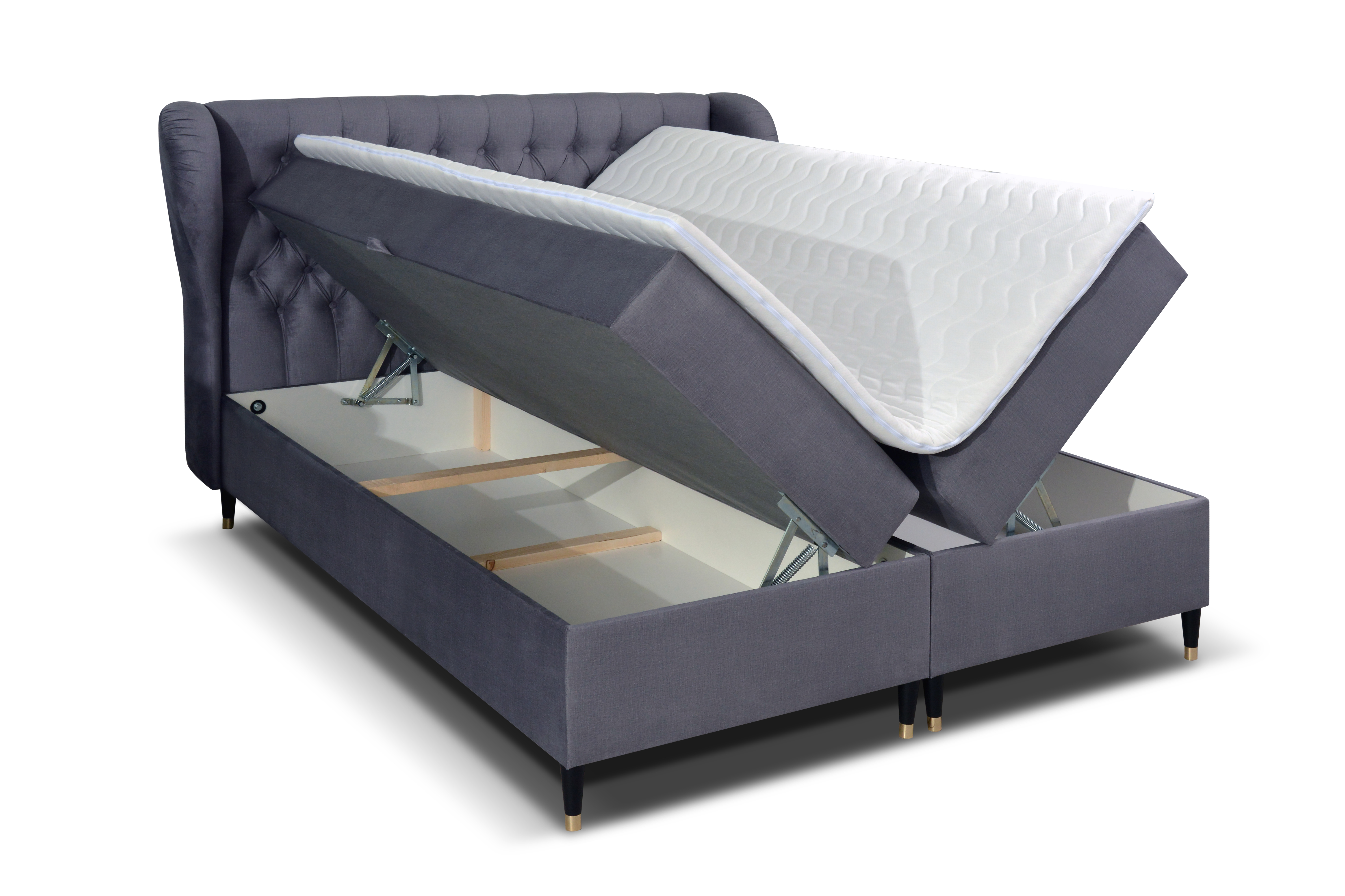 Pohodlná postel moderního designu s krásným dekorativním prošíváním na záhlaví, na které si dosyta odpočinete. Postel má dva úložné prostory, do kterých si umíte uložit ložní prádlo a jiné doplňky. Postel je vyplněna taštičkovými pružinami a pěnou. K posteli je dodáván bílý topper. Zadní část záhlaví postele je potažena šedou látkou.
