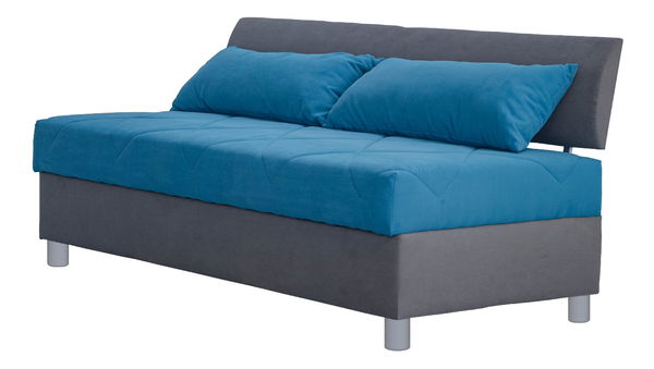 Stylová válenda Roman je v moderní barevné kombinaci šedé a modré. Válendu můžete využít nejen jako postel, ale díky pohodlnému čalouněnému čelu, může sloužit i jako designová pohovka v obývacím pokoji či kanceláři. Výhodou této válendy je i velký úložný prostor. Plochana na spaní má rozměry 90 x 200 cm.