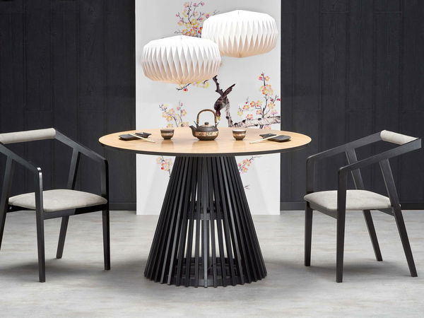 Jídelna Aspull 1 v kombinaci přírodního dubu, černé a šedohnědé barvy působí moderně s orientálním nádechem. Kulatý stůl Myanmar s výraznou podnoží zaujme originálním designem a přirozeným vzhledem. Dvě židle Aspull s černým rámem a šedohnědým čalouněním poskytují pohodlí a stylový kontrast. Tato sestava je ideální do kompaktního, designově sladěného interiéru.