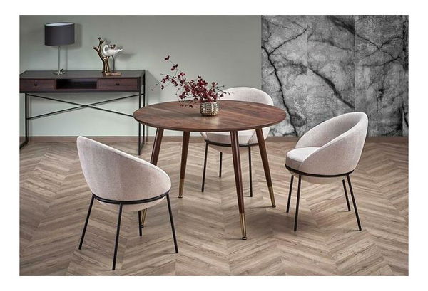 Jídelna Domingo 1 v kombinaci ořechu, zlaté a béžové přináší do interiéru elegantní retro styl. Kulatý jídelní stůl Domingo se zlatými detaily na nohou je určen pro 3 osoby a působí vzdušně a stylově. Tři jídelní židle Kym s béžovým čalouněním a černýma kovovými nohami nabízejí pohodlí a jemný kontrast. Ideální volba pro útulné stolování v malém prostoru s důrazem na design.