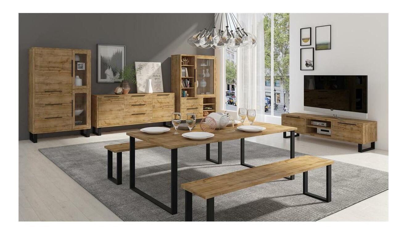 Dub wotan působí v této jídelní sestavě příjemně teplo a přirozeně, čímž okamžitě vnáší do prostoru domáckou atmosféru. Výrazné horizontální linie a kontrastní černé úchyty dodávají nábytku moderní charakter s jemným industriálním nádechem. Komoda a vitrína nabízí dostatek místa na nádobí, textilie či dekorace, zatímco rozkládací jídelní stůl se postará o pohodlí při rodinných obědech i větších návštěvách. Ideální řešení pro ty, kdo chtějí praktickou a zároveň stylovou jídelnu.