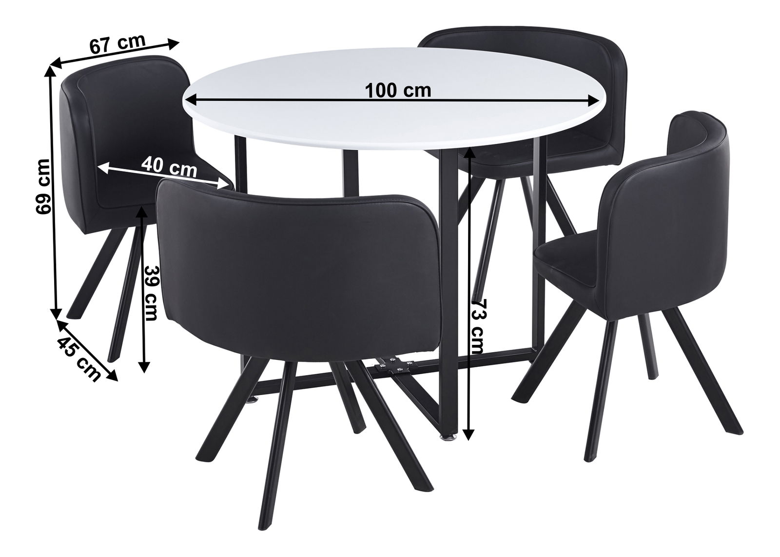 Moderní jídelní set Babeth 1+4 je vhodným kusem nábytku nejen v jídelně vašeho domova, ale také v různých restauračních provozech či školních jídelnách. Plát stolu je vyroben z kvalitní MDF v bílém provedení a upevněn je na pevných kovových nohách. Součástí kompletu jsou kromě stolu také čtyři křesla, která jsou v černém provedení. Tento set si získá každého, protože dokáže vytvořit potřebné místo k sezení. Po použití nezabere moc místa díky tomu, že židle kopírují linie stolu a po zasunutí dokonale splynou s jeho tvary.