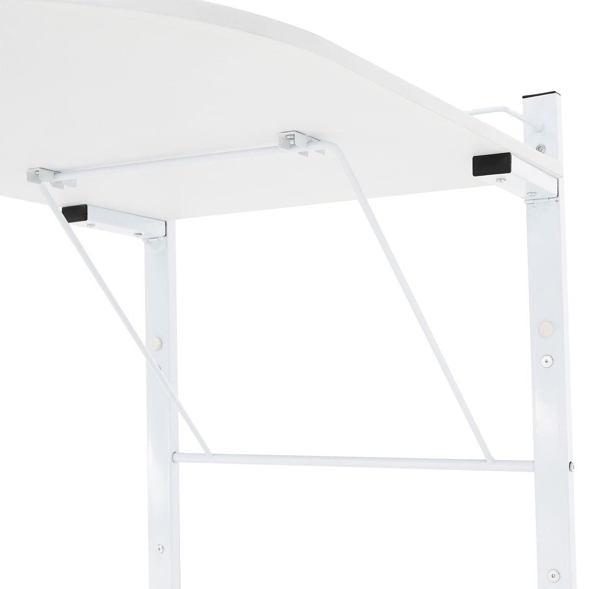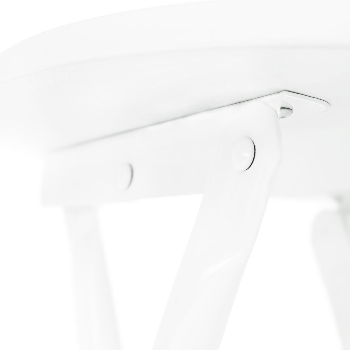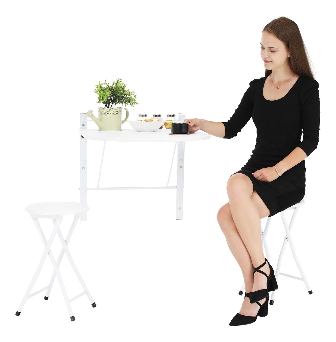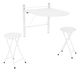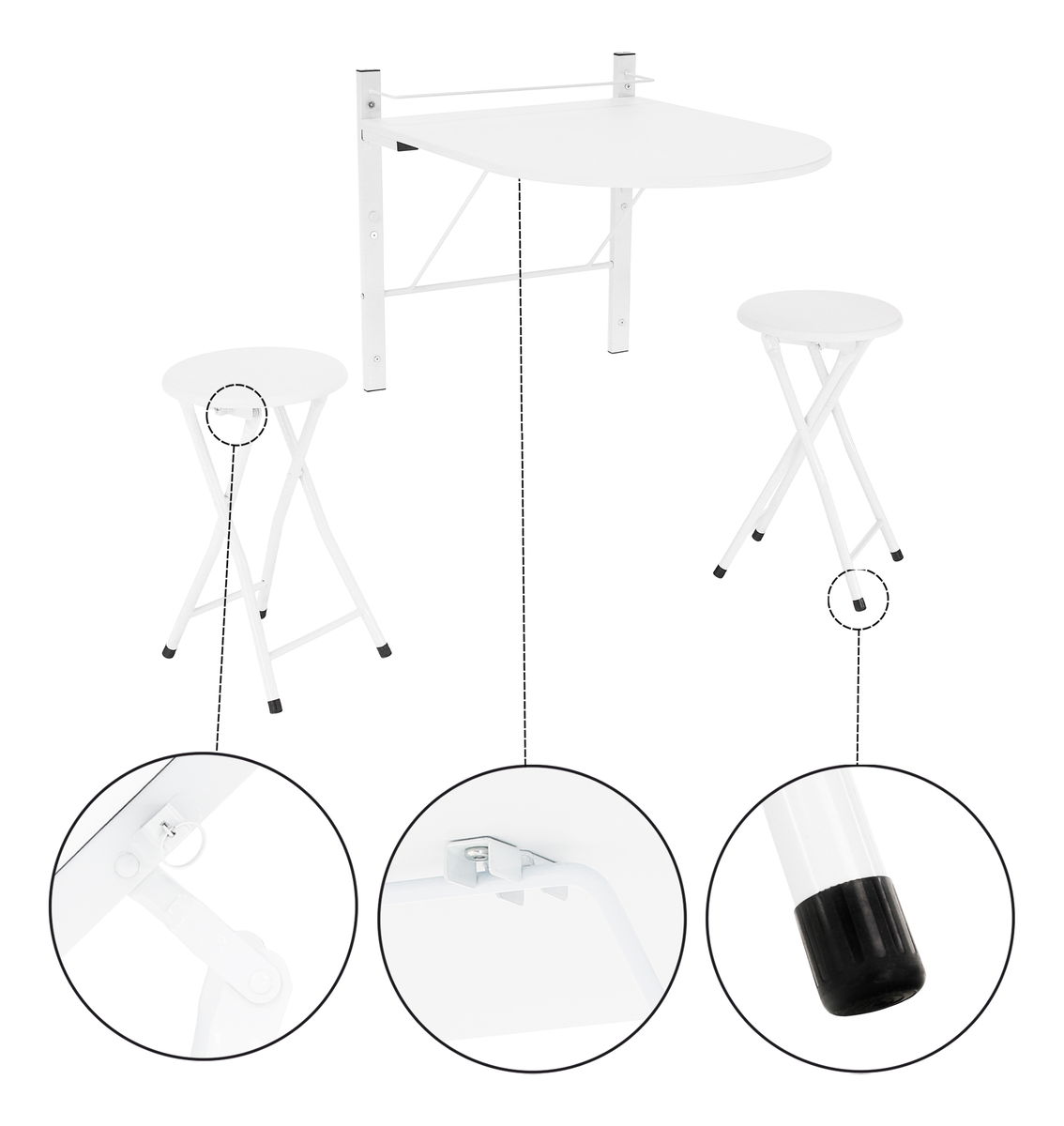 Zajímavý jídelní set, který šetří prostor v kuchyni nebo jídelně. Zaoblený stůl se uchycuje přímo na stěnu a má i kovovou přihrádku pro kořenky, či nádobu s příborem. Ke stolu jsou i dvě menší židle s kulatým sedákem. Barevné provedení stolu je bílá barva.