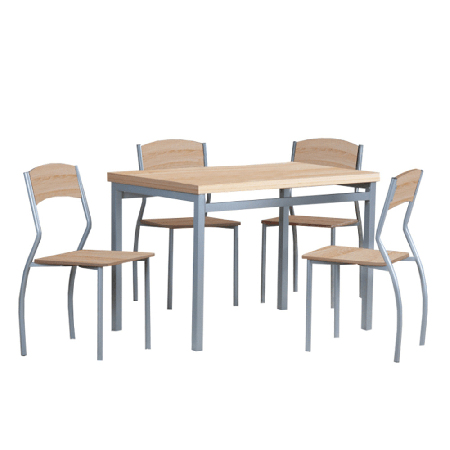 Tímto jídelním setem si zmodernizujete vaše jídelny a kuchyně. Set se skládá z jídelního stolu a čtyř židlí. Hranatý jídelní stůl má hrubší kovové nohy a desku v barevném provedení dub sonoma. Jídelní židle mají zaoblené zadní nohy a tvarované opěradlo. Barevné provedení sedadel a opěradel židle je dub sonoma.