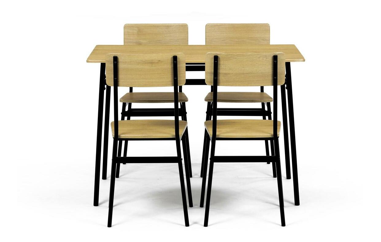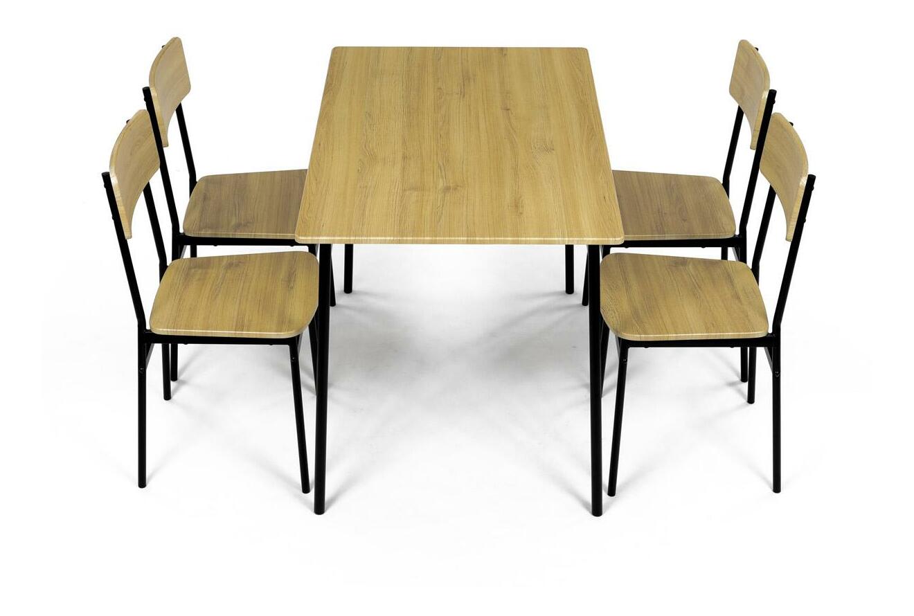 Jídelní set v industriálním stylu je ideální volbou pro moderní interiéry. Sestava obsahuje stůl a čtyři židle s černýma kovovými nohama, které vytvářejí zajímavý kontrast s prkny v dekoru divokého dubu. Stůl i židle jsou vyrobeny z kvalitního MDF, které zaručuje vysokou odolnost a stabilitu. Tento set je navržen pro pohodlné stolování čtyř osob a perfektně se hodí do jídelny. Díky svému minimalistickému designu a přírodním tónům snadno zapadne do každého moderního domova.