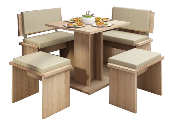 ZobrazitMenší jídelní set se barevným provedením hodí jak do moderně, tak i klasicky zařízené jídelny. Světlá barva stále populárnějšího dřeva dub sonoma je doplněna o krémovou barvu sedáků. Za stolek s vrchní deskou čtvercového tvaru, se pohodlně usadí čtyři osoby na dvě taburetky a dvě lavičky.