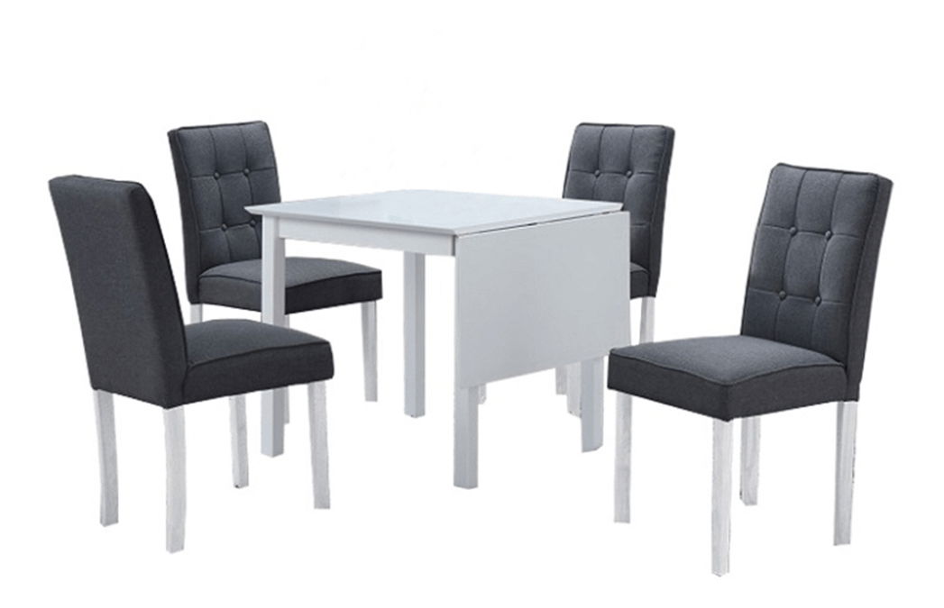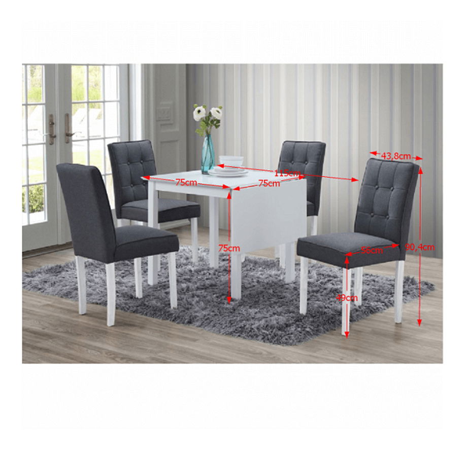 Jídelní set Bygur je ideální pro 4 osoby a sestává ze stolu a čtyř čalouněných židlí. Stol má rozměry 75 x 75-115 x 75 cm a židle mají rozměry 90,4 x 43,8 x 56 cm a výšku sedu 49 cm. Set je vyroben ze dřeva a látky a je k dispozici v bílém a šedém provedení. Židle mají nosnost 100 kg a stejnou nosnost má i stůl. Set se dodává v demontu.