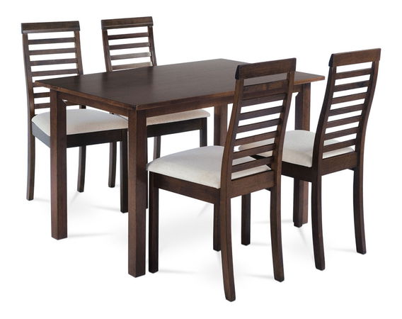 ZobrazitStylový jídelní set. Skládá ze stolu a 4 židlí. Sestava je vyrobena z kaučukového masivu, mořená je do provedení ořech. Horní deska stolu je z dýhy. Židle mají textilní čalounění a příjemný světlý odstín potahu. Opěradlo na záda nemá čalounění.