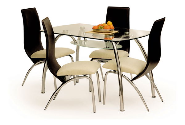 Moderní jídelní set, který zkrášlí každou jídelnu, se skládá se čtyř designově propracovaných židlí a proskleného stolu. Ten má čtyři kovové obloukovitě zahnuté nohy, které drží jako horní desku stolu, tak i menší odkládací plochu. Čalouněný sedák židle béžové barvy je doplněn o opěradlo barvy hnědé. Čalounění je děláno z koženky. Chromová konstrukce doplňuje celkový elegantní vzhled židle.